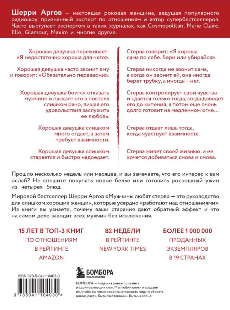 Sherry Argov's world bestseller, Men Love Bitches, is a guide for overly good women who are diligently "working on relationships." From the book you will learn why your efforts have the opposite effect and what really turns on all men without exception. 100 principles of attractiveness, which Sherry formulated for you, will help you always remain for him the woman of dreams, which must be achieved again and again. And you will be able to develop your relationship according to your own scenario.