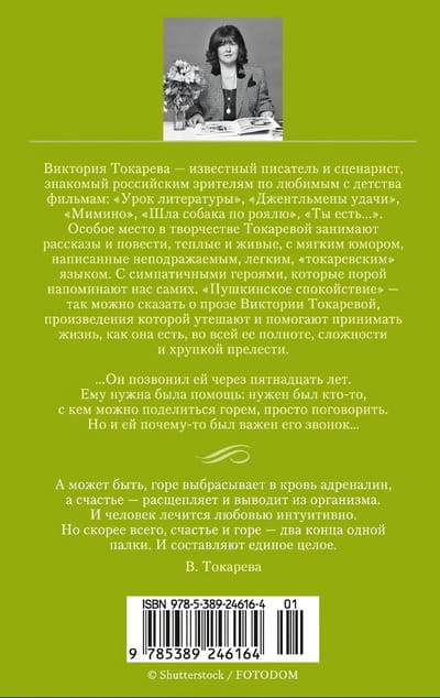 Victoria Tokareva is a well-known writer and screenwriter, familiar to Russian viewers from his favorite films since childhood: “Literature Lesson”, “Gentlemen of Fortune”, “Mimino”, “The Dog Walked on the Piano”, “You Are...” A special place in Tokareva’s work is occupied by stories and stories, warm and lively, with soft humor, written inimitable, light, “Tokarev” language. With cute heroes who sometimes remind us of ourselves. “Pushkin’s tranquility” – so we can say about the prose of Victoria Tokareva, whose works comfort and help to accept life as it is, in all its fullness, complexity and fragile charm. He called her fifteen years later. He needed help: he needed someone to share his grief with, just to talk to. But for some reason it was important for her to call. This edition includes stories and stories of the 2000s.