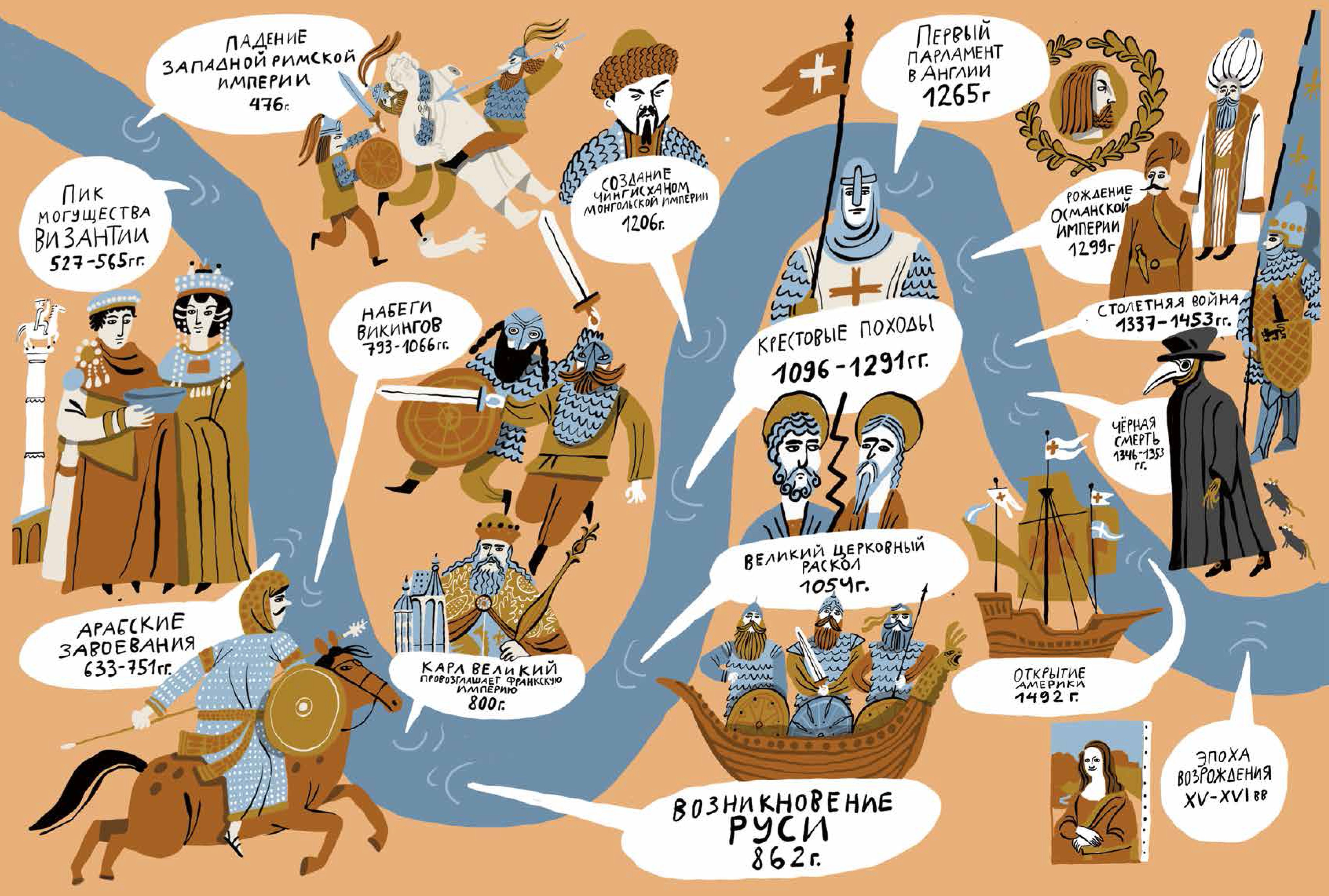 Let's go on a journey: we will visit monastic estates and a knight's castle, on a noisy town square and in the walls of the university, sit at the dinner table with a lord and a peasant, see how artisans work and where traders hurry, join the ranks of pilgrims and crusaders. We will see how the map of Europe changed, how states emerged and collapsed, how some dynasties were replaced by others. We will learn what medieval man was like: what he feared and what he believed in. On this journey you will be lucky enough to see the Middle Ages in all their glory!