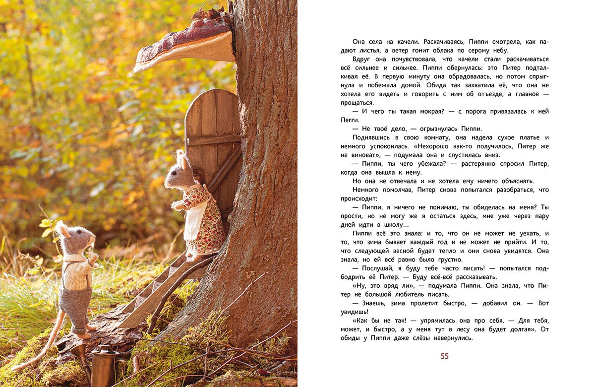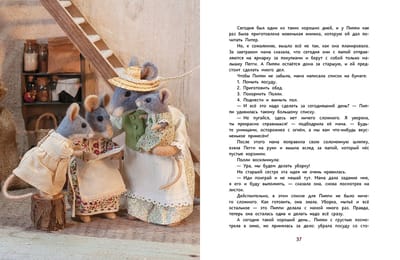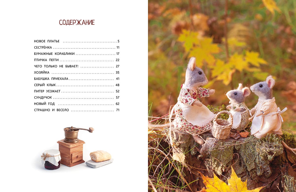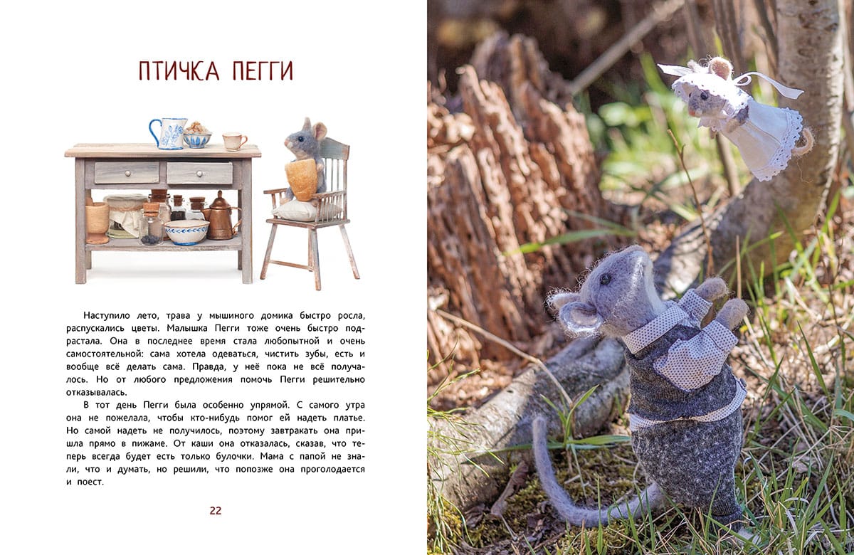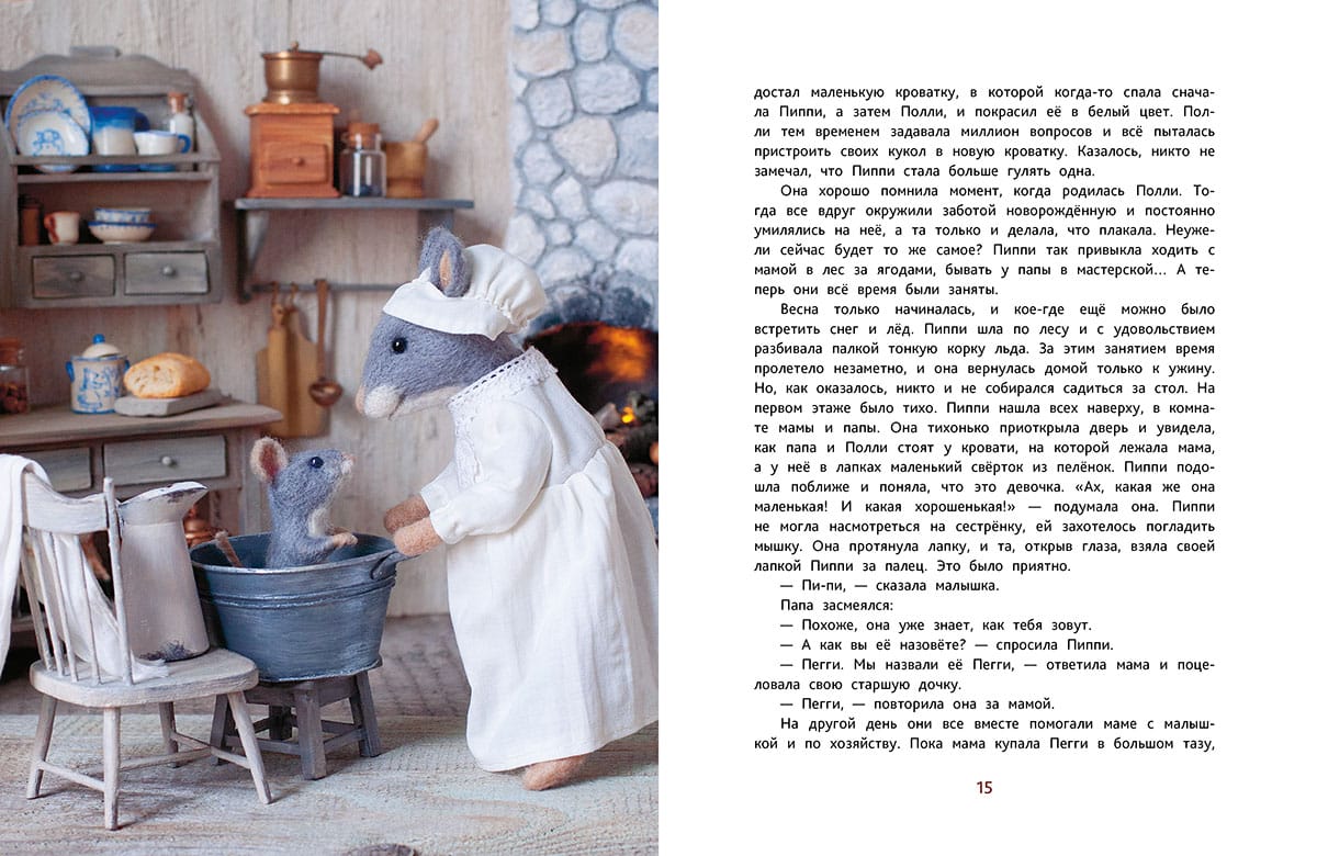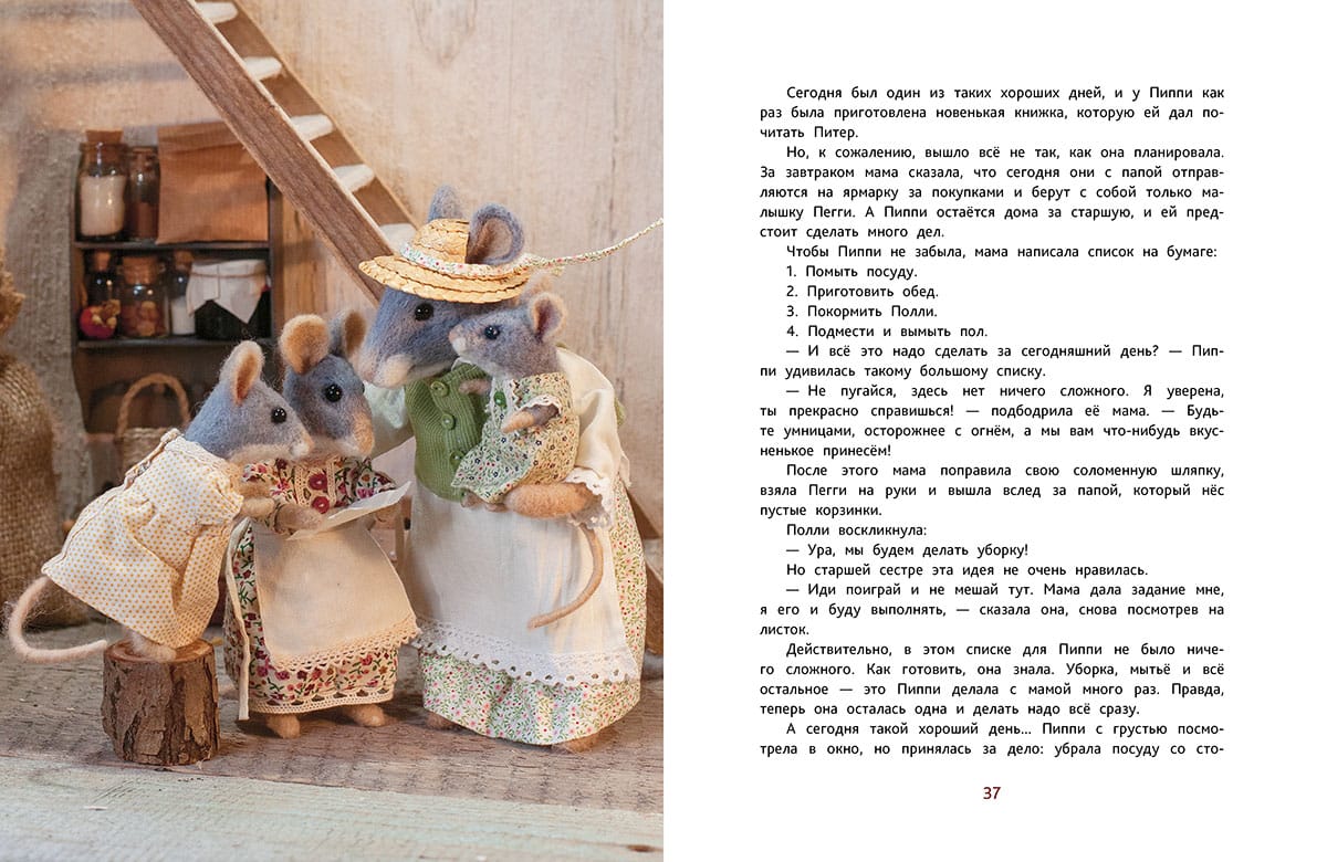 In the depths of a big forest lives a mouse family: mom, dad and sisters Pippi, Polly and Peggy. If you look closely, you can recognize their home in the beautiful old stump: tiny windows hidden in the folds of the bark, a few steps leading up to a small door, and smoke coming from a chimney on the moss-covered roof. This is the coziest house in the world: there is always a delicious smell of baked goods, the stove hums pleasantly and the wooden steps creak softly.