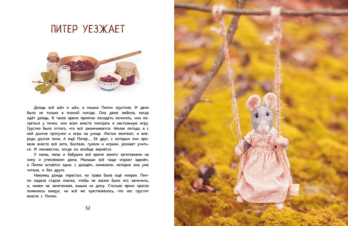 The little mouse Pippi has favorite activities for every season: in spring it is great to launch boats in the stream and make bouquets of the first flowers, in summer - to swim and swing high on the swings, in autumn - to pick berries, and in winter - sledding down the hill. But new impressions and exciting events are already waiting for the mouse: Pippi will meet a real friend, go on a treasure hunt under the careful guidance of the imaginative grandfather and try not to get into the clutches of an imaginary pack of wolves. And also to learn a lot: to be responsible and not to take offense at trifles, not to be afraid and believe in their own strength. Kind, charming, filled with family warmth and coziness "Mouse Stories" will certainly captivate the youngest readers and make reading an interesting and long-awaited event. The charming characters of this book were invented, made and photographed by Liza Bukhalova, and Egor Fomich wrote about their adventures.