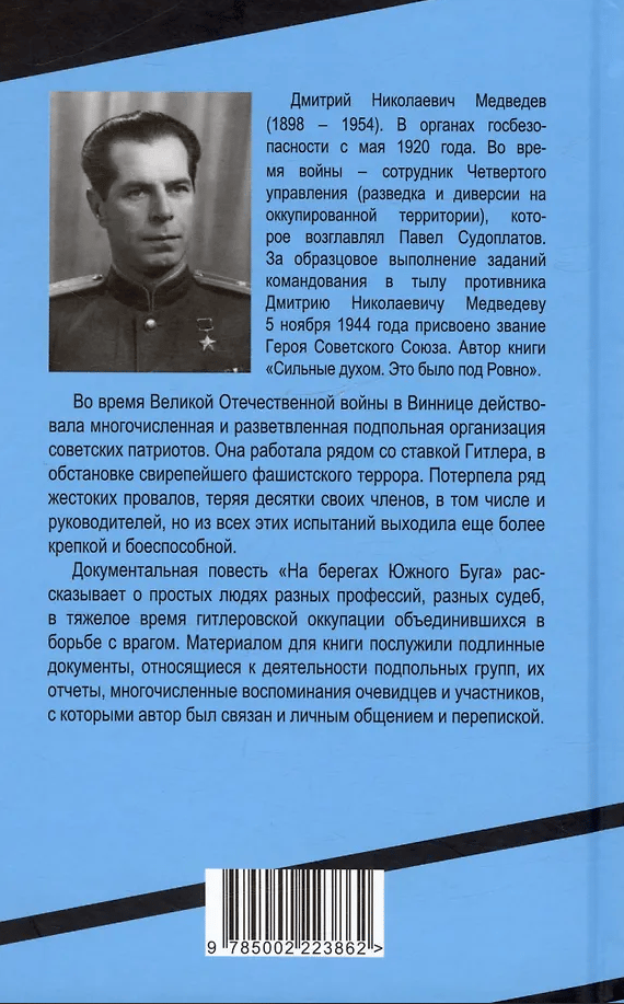 The documentary novel "On the Banks of the Southern Bug" tells the story of ordinary people of various professions and backgrounds who, during the difficult times of Nazi occupation, united to fight the enemy. The book draws on authentic documents relating to the activities of underground groups, their reports, and numerous memoirs of eyewitnesses and participants with whom the author communicated personally and corresponded.