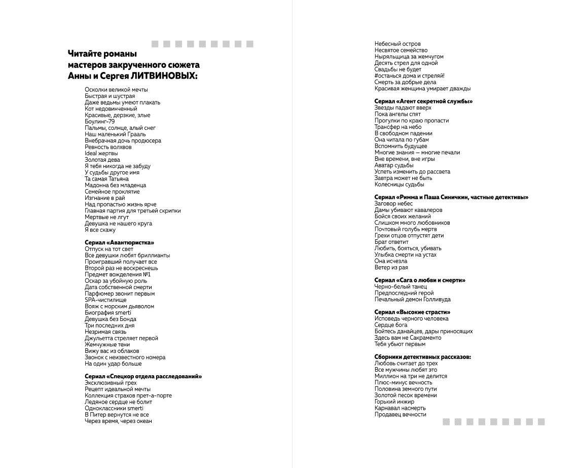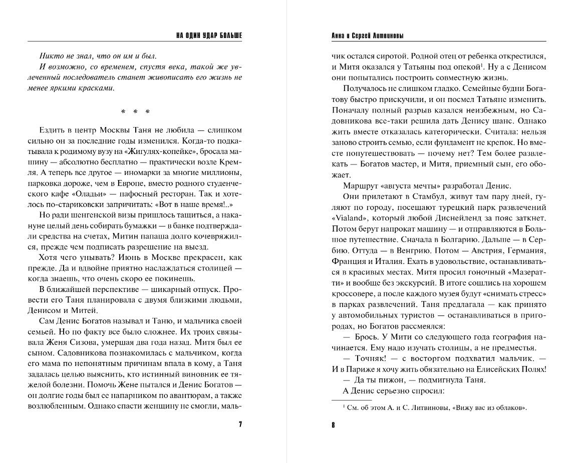 A twisted intrigue, characters that are understandable and close to the reader, modern problems - this is the secret of the success of a good detective story by the Litvinovs. The investigation is again led by good heroes known to readers from novels and TV series - adventurer Tatyana Sadovnikova and her stepfather, retired colonel of foreign intelligence Valery Khodasevich.