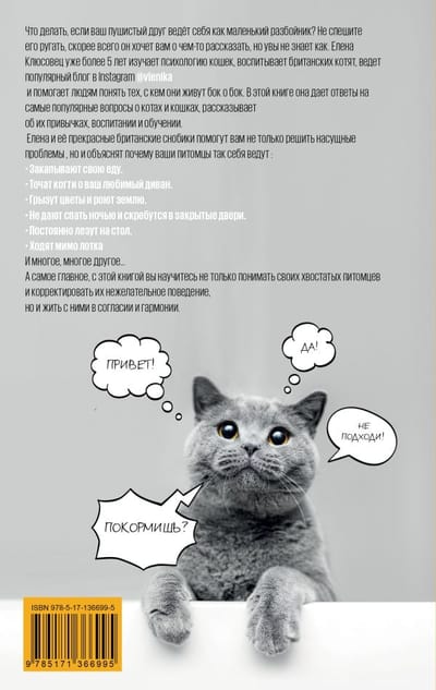 What to do if your furry friend behaves like a little bandit? Don't rush to scold him, most likely he wants to tell you something, but alas he doesn't know how. Elena Klusovets has been studying cat psychology for more than 5 years, raising British kittens, running a popular blog on Instagram @vlenika and helping people to understand those with whom they live side by side. In this book, she answers the most popular questions about cats and felines, talks about their habits, upbringing and training. Elena and her beautiful British snobby cats will help you not only to solve urgent problems, but also explain why your pets behave the way they do: Bury their food, sharpen their claws on your favorite sofa, chew flowers and dig the ground, do not let you sleep at night and scratch at closed doors, constantly climb on the table, go past the litter box. And much, much more... And most importantly, with this book, you will learn not only to understand their tail pets and correct their undesirable behavior, but also to live with them in harmony and harmony.