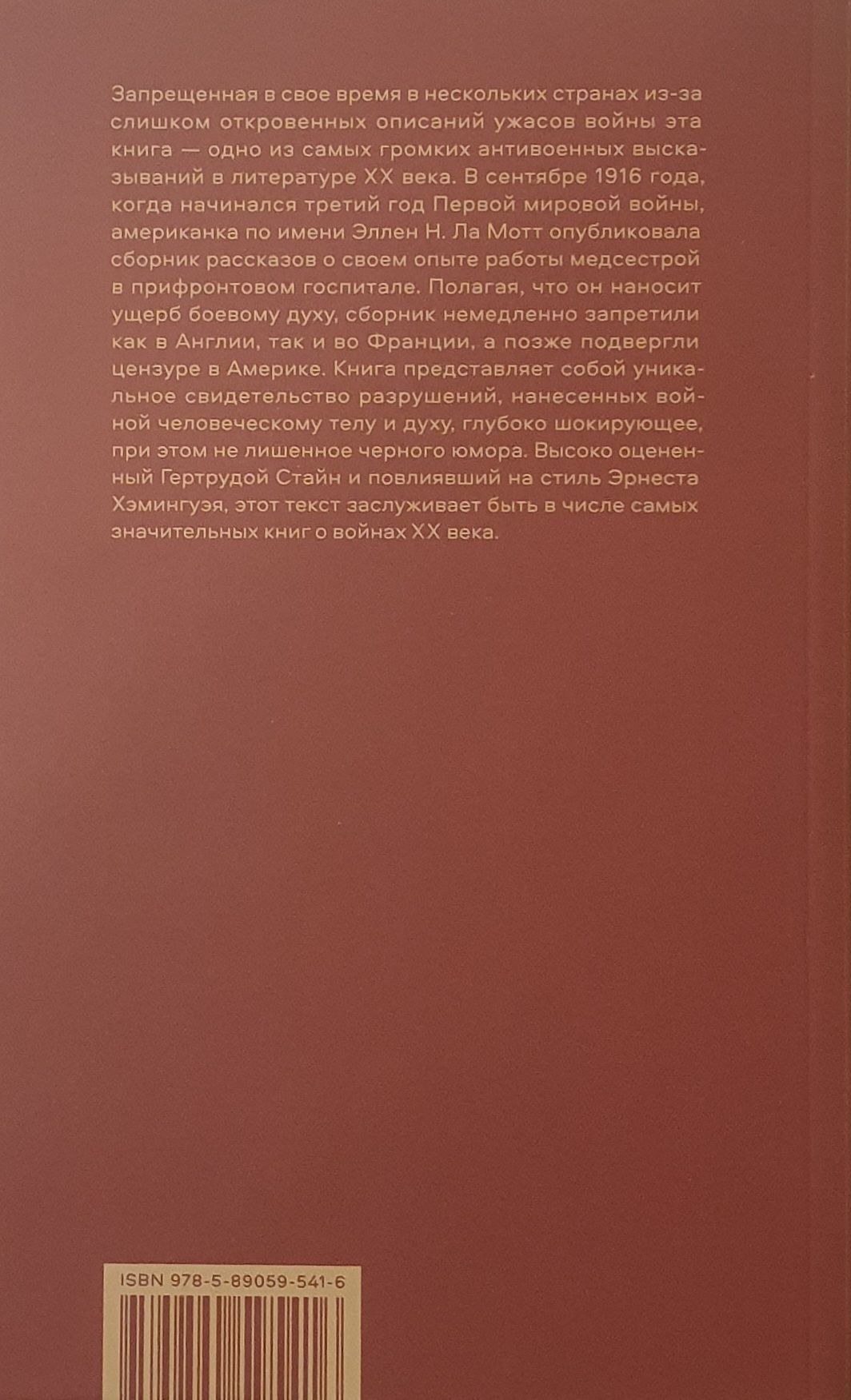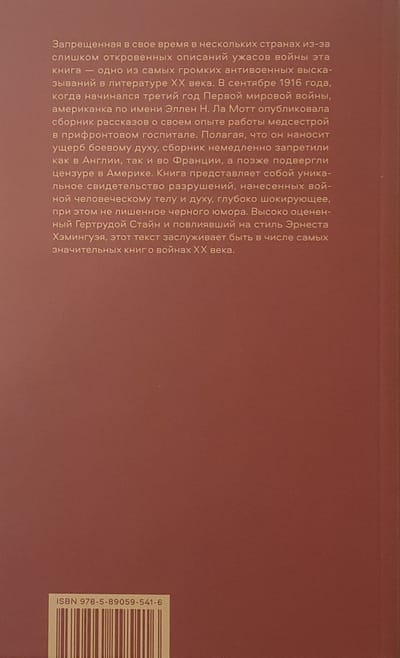 Banned in several countries for its overly explicit descriptions of the horrors of war, this book is one of the loudest anti-war statements in twentieth-century literature. In September 1916, as the third year of World War I began, American Ellen N. La Mott published a collection of short stories about her experiences as a nurse in a front-line hospital. Believed to be detrimental to morale, the collection was immediately banned in both England and France, and later censored in America. The book is a unique account of the devastation wrought by war on the human body and spirit, deeply shocking while not lacking in black humor. Highly praised by Gertrude Stein and influencing the style of Ernest Hemingway, this text deserves to be among the most significant books on the wars of the twentieth century.