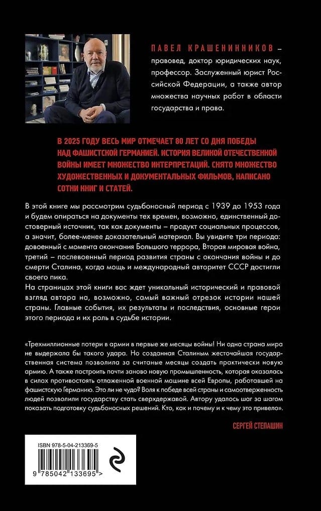 This publication is a sequel to "The State versus Revolution" and will introduce the reader to the horrific events of World War II from the perspective of state and law. How the country prepared for war and what measures were taken in the pre-war period, what laws governed the country during the Great Patriotic War, how the Soviet Union was rebuilt after victory—you will find answers to these and many other questions in this book, dispelling the myths surrounding the most devastating military campaign in human history. If you are fascinated by Russian history, its statehood, and law, and want to understand how the development of jurisprudence influenced the strengthening of the state, this book will be a valuable addition to your library.