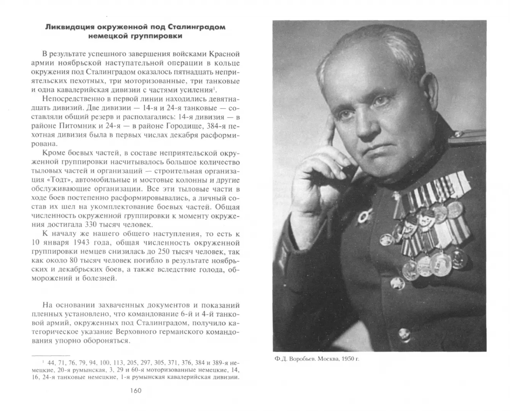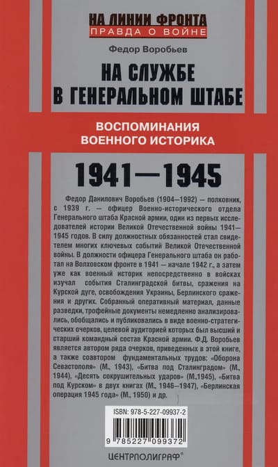 Fyodor Danilovich Vorobyov (1904-1992) was a colonel and, from 1939, an officer in the Military History Department of the General Staff of the Red Army. He was one of the first researchers into the history of the Great Patriotic War of 1941-1945. His official duties allowed him to witness many of the war's key events. As an officer in the General Staff, he served on the Volkhov Front in 1941 and early 1942, and then, as a military historian, he studied the events of the Battle of Stalingrad, the Battle of Kursk, the liberation of Ukraine, the Battle of Berlin, and others directly in the field. The collected operational material, intelligence data, and captured documents were immediately analyzed, summarized, and published as military-strategic essays, the target audience of which was the senior and highest command staff of the Red Army. F.D. Vorobyov is the author of a number of essays cited in this book, and also a co-author of fundamental works: “The Defense of Sevastopol” (Moscow, 1943), “The Battle of Stalingrad” (Moscow, 1944), “Ten Crushing Blows” (Moscow, 1945), “The Battle of Kursk” in two books (Moscow, 1946-1947), “The Berlin Operation of 1945” (Moscow, 1950), etc.