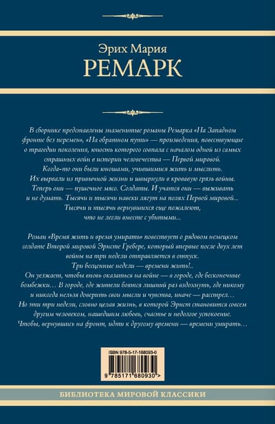 The collection includes Remarque's famous novels "All Quiet on the Western Front" (1929), "On the Way Back" (1931) - works that tell of the tragedy of a generation whose youth coincided with the beginning of one of the most terrible wars in human history - the First World War.