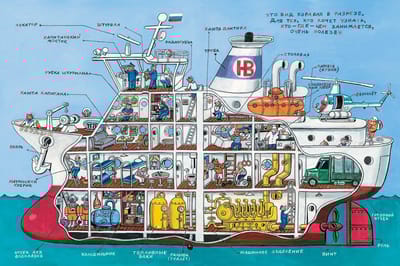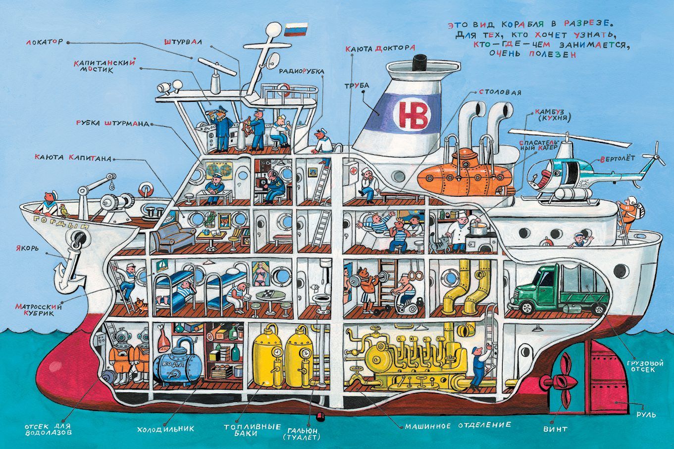The book, without exaggeration, universally embraces the nautical theme. There is everything that floats on water, from kayaks and surfboards to giant dry cargo ships, icebreakers and battleships. There's everything that floats underwater - from bathyscaphes to submarines. There's everything that flies over water, from firefighting seaplanes to vertical takeoff planes launched from an aircraft carrier. There are drawings explaining how the harbor and shipyard are organized. There is a ship in section with a detailed depiction of its many rooms: cubicles, chopping rooms, compartments, etc. There are all those who are directly related to this immense water industry: sailors, divers, designers, oceanographers, etc. The book's readership is as broad as the subject matter itself. The book will be gladly viewed and read by both children, starting from the early preschool age, and their parents. And everyone will find something intriguing, useful and interesting.