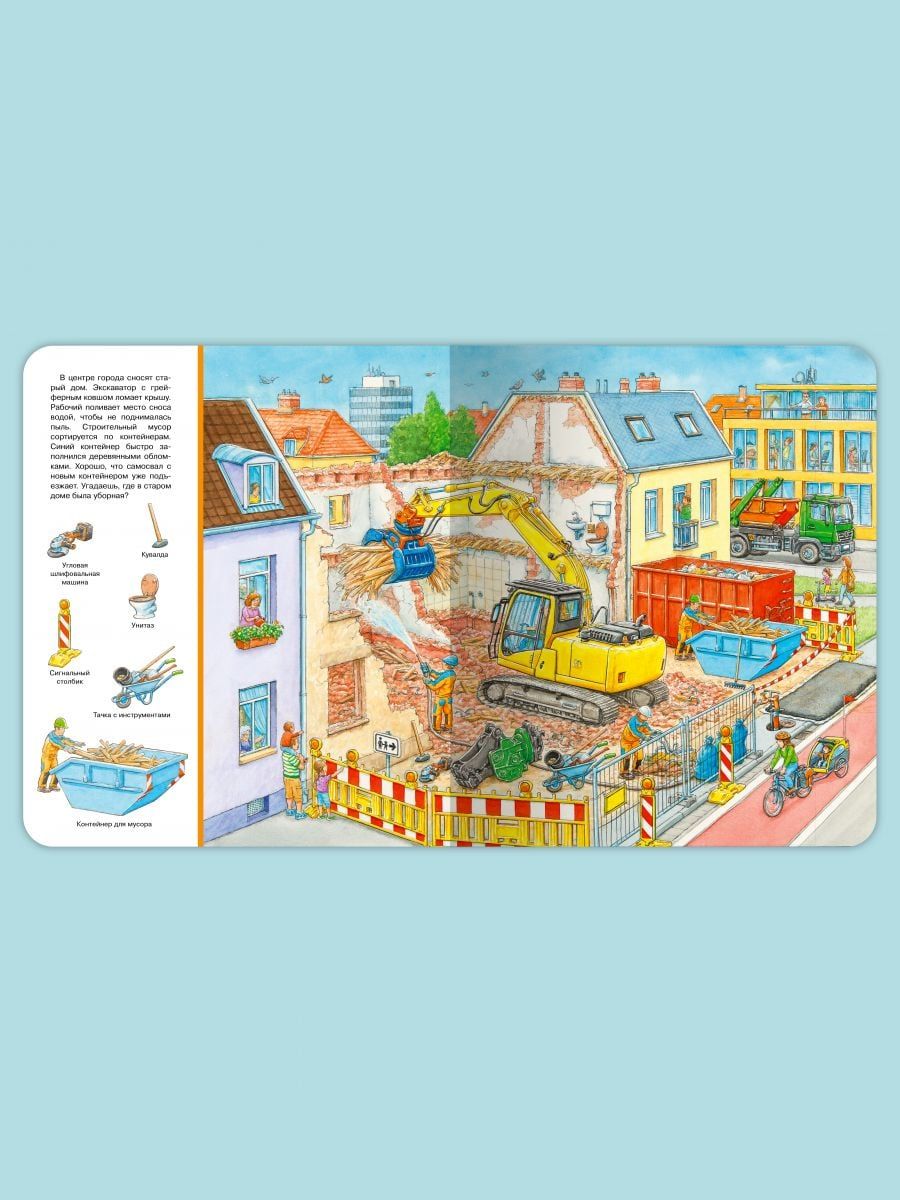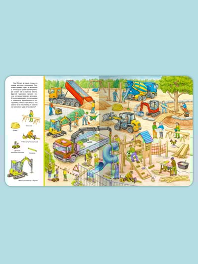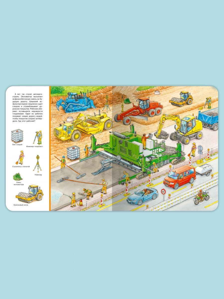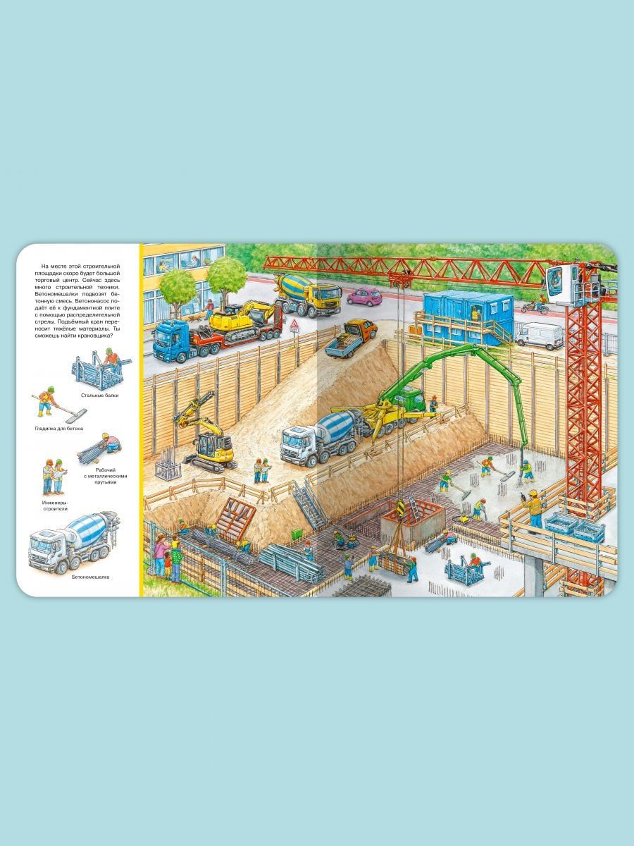 Cognitive wimmelbook "Find and Show. Big Book. At the construction site" will help kids in a playful way to expand their vocabulary. The book will fascinatingly tell and show the baby all the most interesting things about how the construction of various buildings, what transport and what equipment is involved. Favorite "Find and show" on each page will focus and develop the attention of even the most restless kid. The bright, oversized book is printed on high-quality, heavy-duty cardboard with safe, rounded edges. Thanks to the colorful panoramic illustrations children will easily remember the material, and the task "Find and Show" will turn the lesson with your child into an educational game. This gift is sure to please!