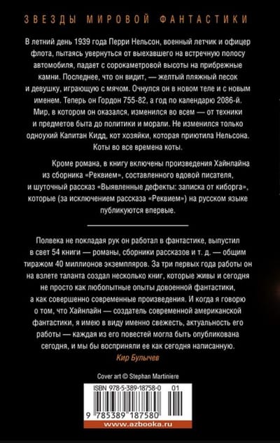 On a summer day in 1939, Perry Nelson, a military pilot and naval officer, trying to avoid a car that drove into the oncoming lane, falls from a height of forty meters onto the coastal rocks. The last thing he sees is yellow beach sand and a girl playing with a ball. He wakes up in a new body and with a new name. Now he is Gordon 755-82, and the year on the calendar is 2086. The world in which he finds himself has changed in everything - from technology and household items to politics and morality. The only thing that has not changed is the one-eared Captain Kidd, the cat of the owner who took Nelson in. Cats are cats at all times. In addition to the novel, the book includes Heinlein's works from the collection "Requiem", compiled by the writer's widow, and the humorous story "Identified Defects: A Note from a Cyborg", which (with the exception of the story "Requiem") are published in Russian for the first time.