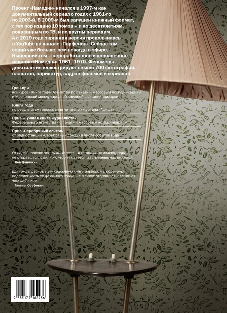 The new, revised and expanded edition of the volume "Namedni 1961-1970" is the most voluminous book of the series. The key Soviet decade of "our era" is represented by a mosaic of 348 events-people-events. The Cuban Missile Crisis and KVN, Saturday off and Stalin's removal from the Mausoleum, Khrushchev apartments and "Cuba - my love!", Gagarin and Glenn, Lieutenant Rzhevsky and Piekha, the long-eared Zaporozhets and the Kennedy assassination, prima Plisetskaya and Pakhmutova's songs, the Novocherkassk shooting and Rodnina, KSP and communism by 1980, Brodsky's expulsion and Streltsov's return, Sorge and the earthquake in Tashkent, the twist and the Taganka Theater, Magomayev and the Moscow Ring Road, Khrushchev's ouster and samizdat, the Berlin Wall and The Diamond Hand, Angelica and the Americans on the Moon, construction teams and Sophia Loren, hulahoop and hoonweibins, Nuriev's escape and the Bratskaya HPP, cloak and bologna and pensions for collective farmers, the Grushinsky Festival and General Secretary Brezhnev, Okudzhava and "Operation "Y", fake fur and Indira Gandhi, the Six-Day War and six acres, "In the World of Animals" and the entry of troops into Czechoslovakia, Brumel and the ballet "Spartacus", amber and "I'm Walking on Moscow", Solzhenitsyn and "Spidola", miniskirts and land reclamation, the war in Vietnam and goalkeeper Yashin, Ikarus buses and Andropov at the head of the KGB, two years in the army and marriage palaces, student Shurik and "Sportloto", Cheburashka and chasing, Oleg Popov and Ostankino, Damansky and village prose, nylon shirts and oil pipeline "Druzhba", March 8 weekend and Vitsin-Nikulin-Morgunov. The volume is illustrated with over 700 photographs, posters, drawings, caricatures, shots from movies and TV series of the decade.