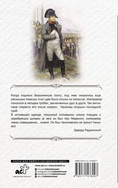 When the nameless slab was lifted, several other heavy slabs (two were cast in metal) were underneath it. The Emperor rested in four coffins, enclosed in one another. So the English guarded him after his death ... Finally opened the last coffin. In decayed clothes, covered with a decayed blue cloak with silver embroidery (in which he had been at Marengo), the Emperor lay perfectly... alive. He was mysteriously untouched by decay! Edward Radzinsky
