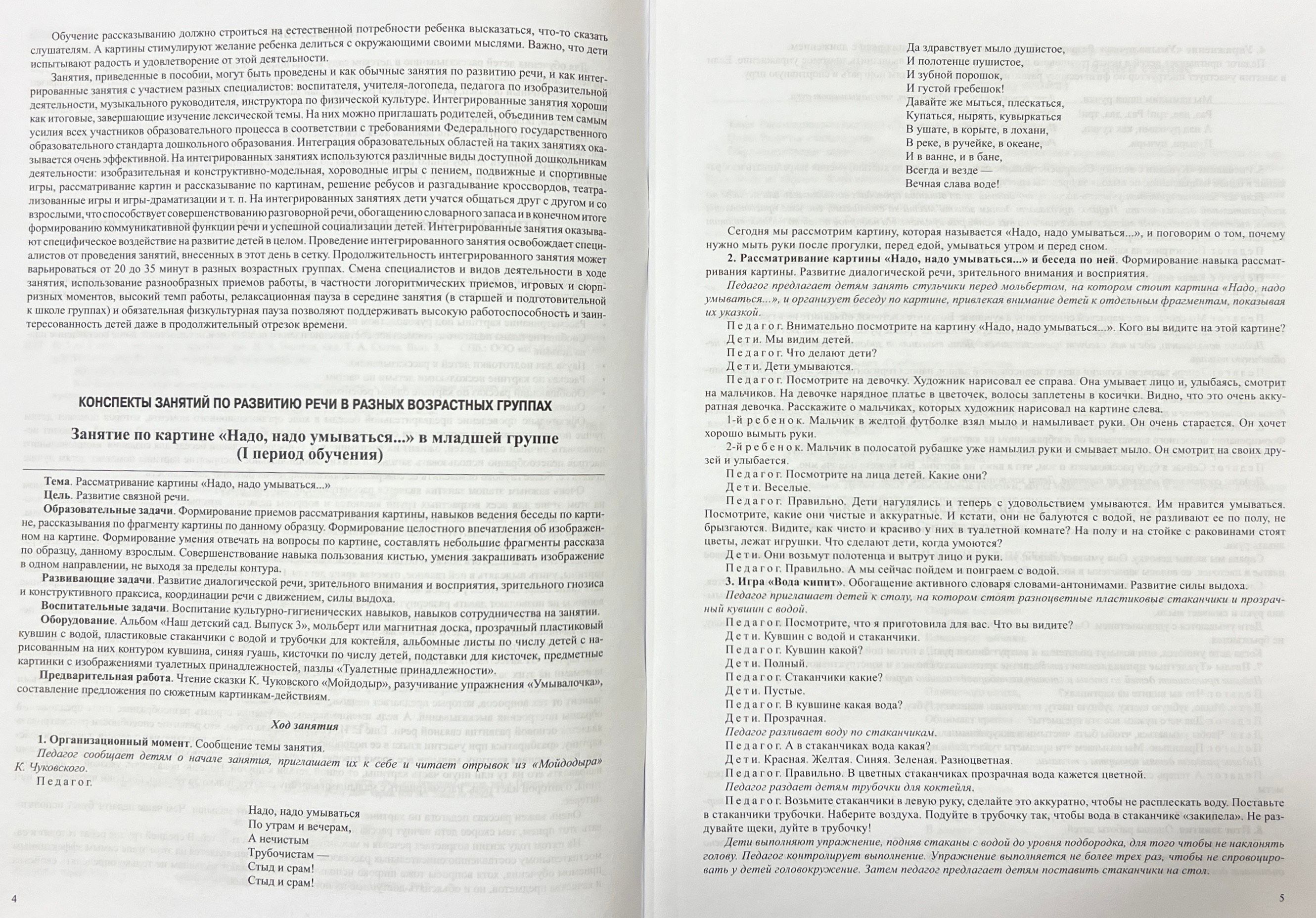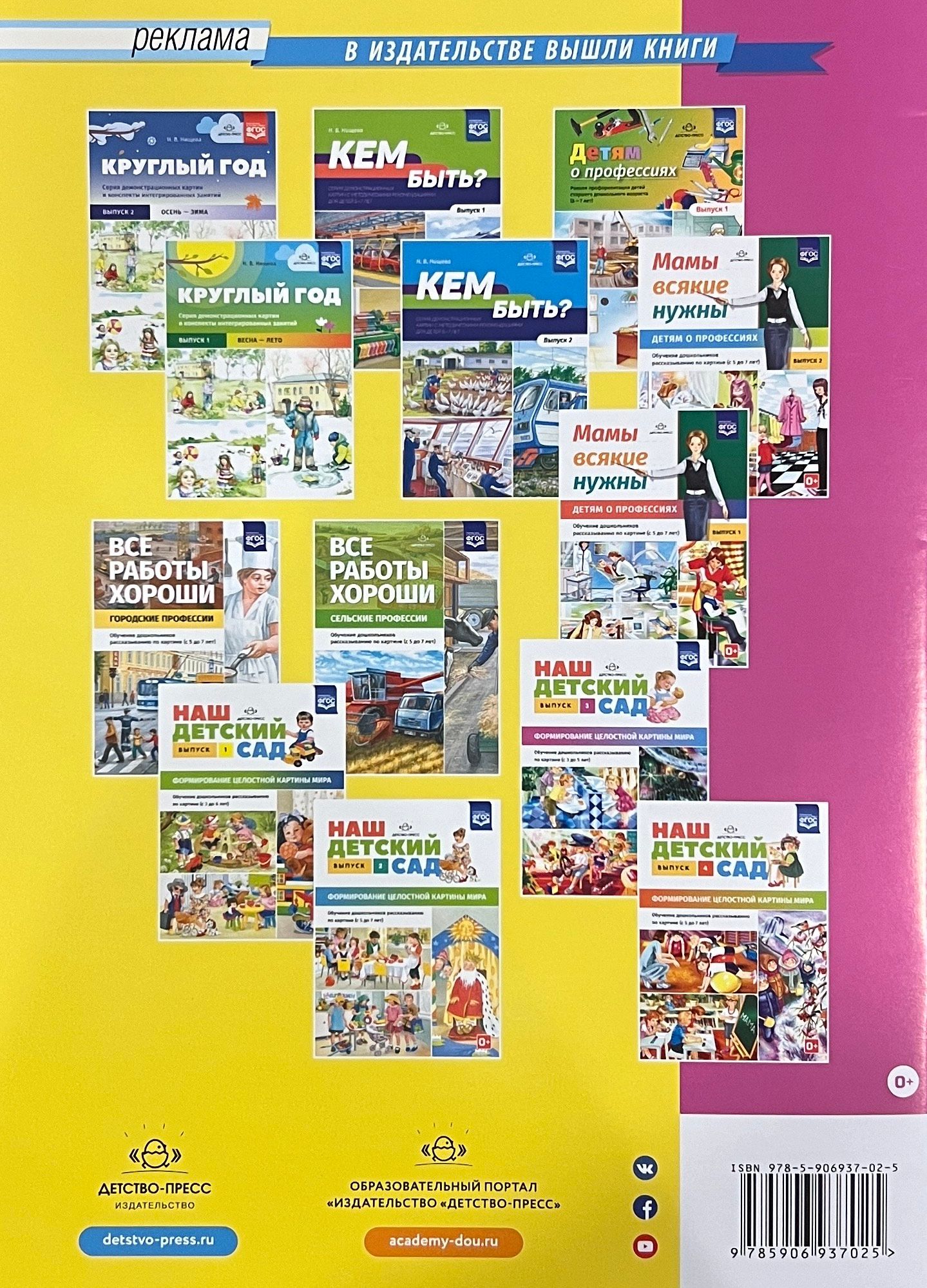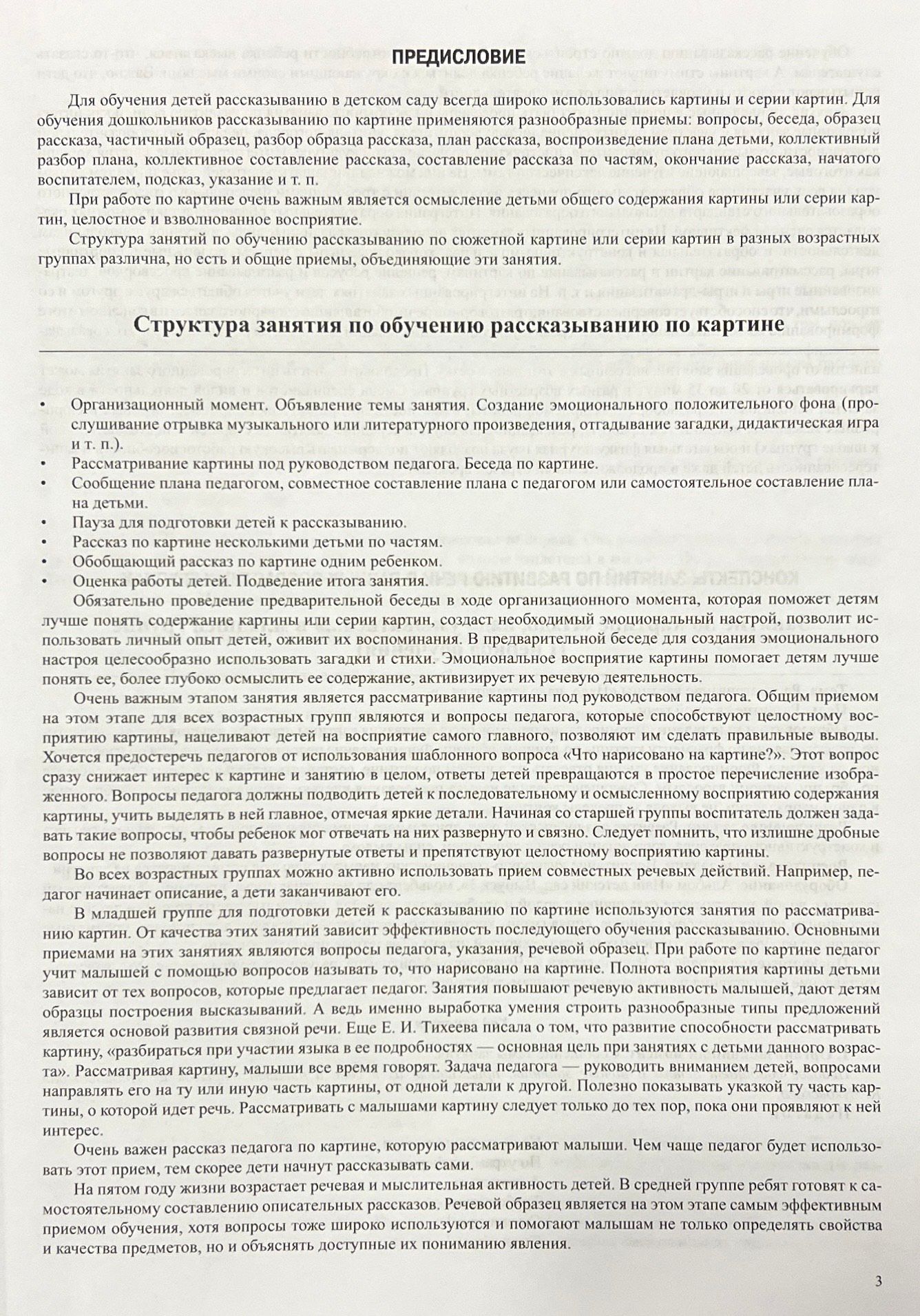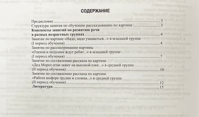 The album contains demonstration pictures and lesson notes for them, including methods of work on speech development in different age groups of kindergarten. The publication is addressed to teachers of general, combined and compensatory kind of preschools.