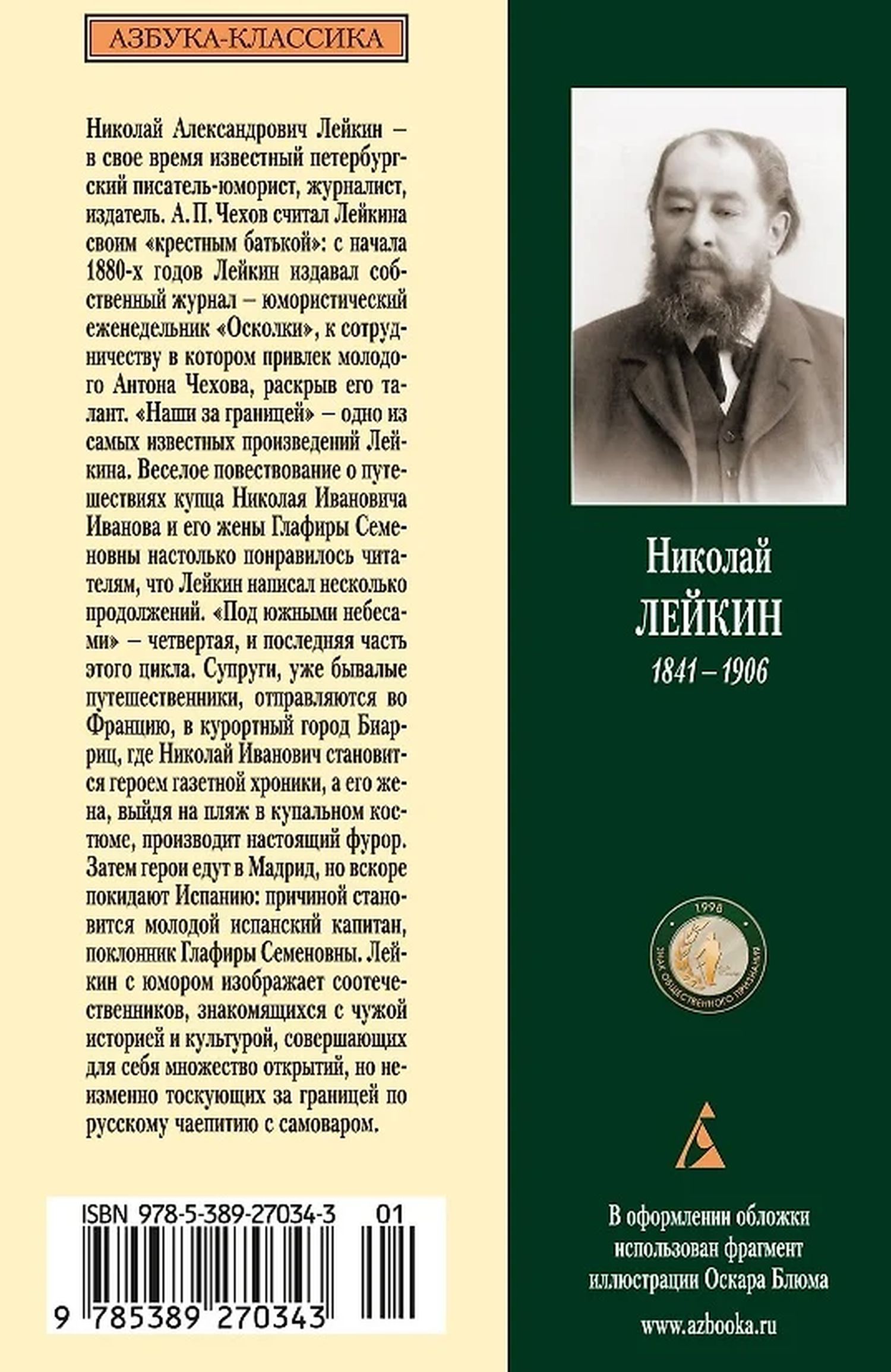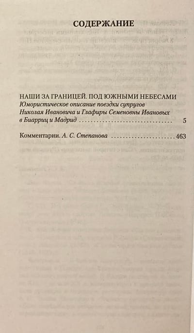 Nikolay Aleksandrovich Leykin was a well-known St. Petersburg humorist, journalist, and publisher in his time. "Our People Abroad" is one of Leykin's most famous works. The cheerful story about the travels of merchant Nikolay Ivanovich Ivanov and his wife Glafira Semyonovna, about the funny adventures and all sorts of misunderstandings that happen to the characters in foreign lands, was so popular with readers that Leykin wrote several sequels. "Under the Southern Skies" is the fourth and final part of this cycle. The couple, already seasoned travelers, go to France, to the resort town of Biarritz, where Nikolay Ivanovich becomes a hero of the newspaper chronicles, and Glafira Semyonovna, going out onto the beach in a bathing suit, makes a real splash. Then the heroes go to Madrid, but soon leave Spain: the reason is a Spanish captain, an admirer of Glafira Semyonovna. Leikin humorously portrays his compatriots getting to know foreign history and culture, making many discoveries for themselves, but invariably yearning for Russian tea drinking with a samovar abroad.