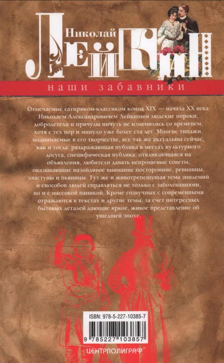 The human vices, virtues, and quirks highlighted by Nikolai Alexandrovich Leikin, a classic satirist of the late 19th and early 20th centuries, have not changed at all over time, even though more than a century has passed since then. Many of the characters explored in his work remain as relevant today as they were then: irritating crowds in cultural venues, the peculiar crowd responding to advertisements, those who offer unsolicited advice, strangers who pay intrusive attention, jealous people, braggarts, and drunkards. There's also the pressing topic of epidemics and people's ways of coping not only with illness but also with mass panic. In addition to topics resonating with contemporary themes, the texts also reflect other themes, which, through interesting everyday details, provide a vivid, vivid glimpse into a bygone era.