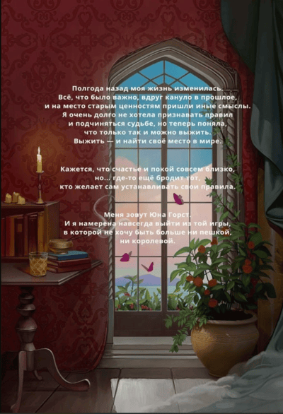 My name is Yuna Gorst. And I intend to leave this game forever, in which I no longer want to be either a pawn or a queen.