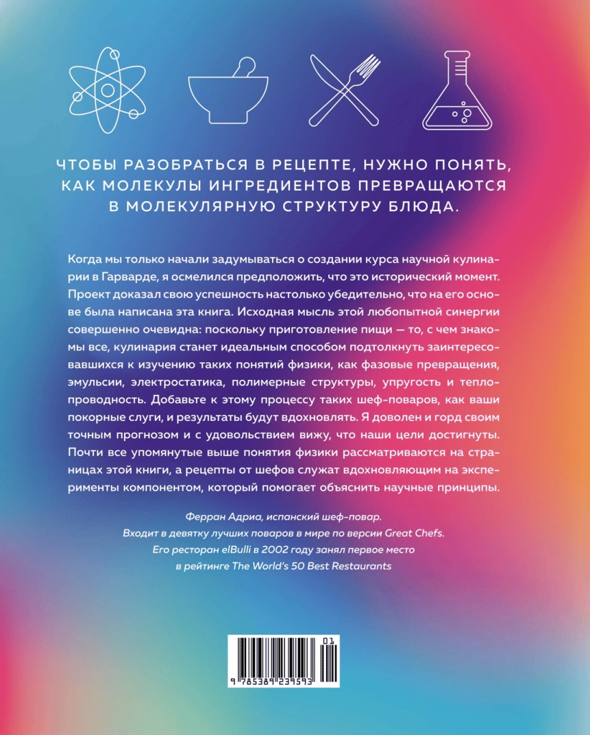 "Chefs around the world know the truth: cooking is science and science is cooking. Throughout history, many amazing discoveries have been made by scientists working with foods and chefs using a scientific approach. Nicolas Apper, a French pastry chemist and chemist, was the inventor of the preservation process, a new way to safely store food, in the early 19th century. Pasteurization technology, proposed by microbiologist Louis Pasteur, revolutionized the food industry - and probably saved millions of lives along the way. In this book, we look at food as science, but food is also history, culture, diplomacy, national security, and much, much more. Society will be stronger if we better understand where food comes from and how much it affects the world around us. That's why this book - and the Harvard course on which it is based - is such a meaningful resource. Interesting for everyone, not just those studying the exact sciences, it will help readers make connections and build a systematic picture of the fascinating world of food." Jose Andres, American Chef. Winner of the 2009 Chef of the Year, James Beard Foundation Outstanding Chef, and GQ Magazine's 2009 Man of the Year awards.