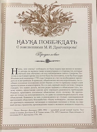 "The Science of Victory" is a brilliant work by the greatest Russian commander Alexander Vasilyevich Suvorov (1730-1800). The book is a universal guide, which concisely sets out the essence of Suvorov's system of effective training and education of troops, the basic rules of his military strategy and tactics. It was thanks to these rules, this system, that the troops under Suvorov's command won many victories and did not suffer a single defeat.
