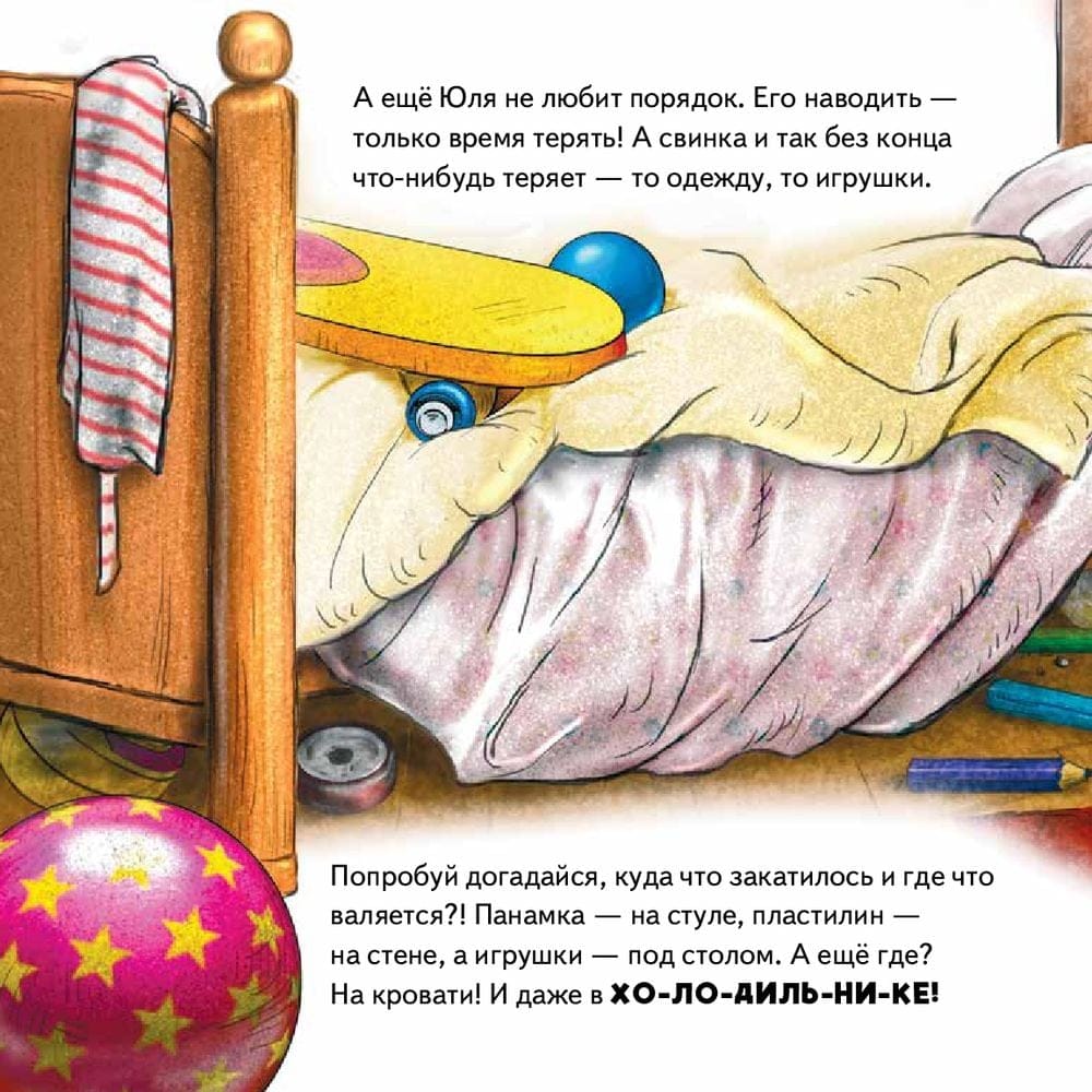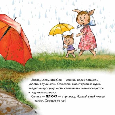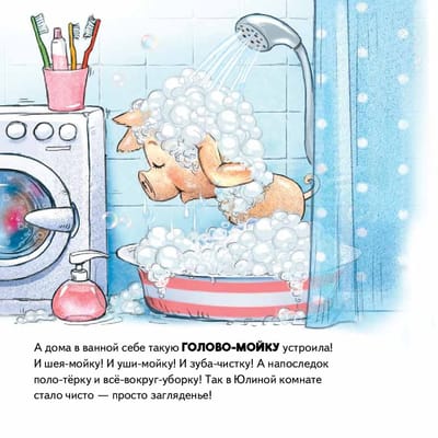 Little piggy Yulia is a real messy person. She doesn't like to bathe, brush her teeth and clean up her toys. And also Julia always chooses the dirtiest puddles to get dirty in them. But once the pig got into a very unpleasant story, after which she decided to always be clean and tidy. Do you want to know what happened to her? Make yourself comfortable! It's time for a good tale from Mommy Kitty. Books in the series "Naughty Baby. Tales from Mommy Cat" help little readers easily deal with disobedience, stubbornness, poor sleep and appetite... Wise Mama Cat knows all the secrets of good behavior! Series illustrator Rina Zenyuk is the author of the famous Blue Cats, loved by kids and their parents all over the world. The author of the foreword in verse is Tatiana Koval.