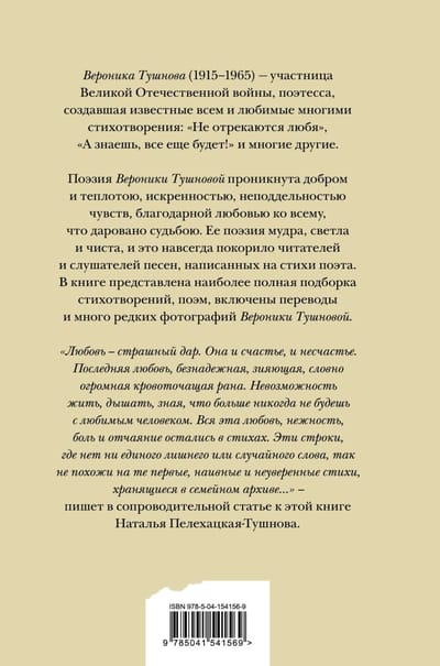 Veronika Tushnova (1915 - 1965) - participant of the Great Patriotic War, poetess, who created poems known to all and loved by many: "They do not renounce loving", "And you know everything will still be!" and many others. Veronika Tushnova's poetry is imbued with kindness and warmth, sincerity, genuineness of feelings, grateful love for everything that fate has given. Her poetry is wise, bright and pure, and this has forever captivated readers and listeners of songs written to the poet's verses. The book presents the most complete selection of poems, poems, includes translations and many rare photographs of Veronika Tushnova.