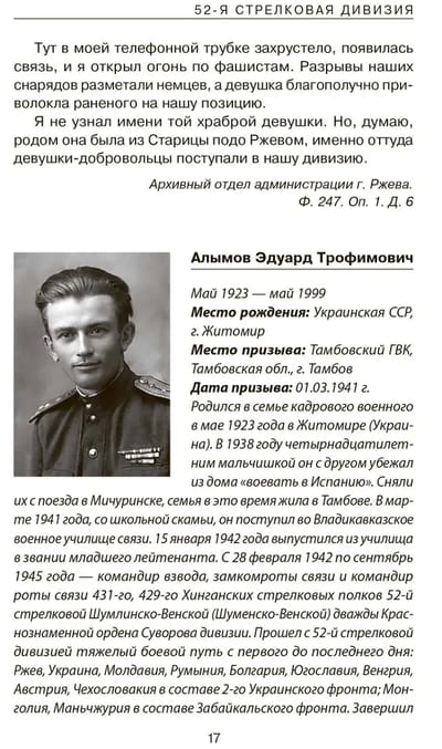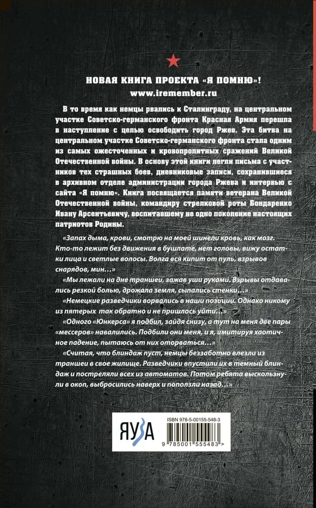 The new book of the project "I Remember!" While the Germans were rushing to Stalingrad, on the central section of the Soviet-German front the Red Army went on the offensive to liberate the city of Rzhev. This battle on the central section of the Soviet-German front became one of the fiercest and bloodiest battles of the Great Patriotic War. This book is based on letters from the participants of those terrible battles, diary entries preserved in the archival department of the Rzhev city administration and interviews from the site "I Remember". The book is dedicated to the memory of the veteran of the Great Patriotic War, commander of the rifle company Bondarenko Ivan Arsentievich, who brought up more than one generation of true patriots of the Motherland.