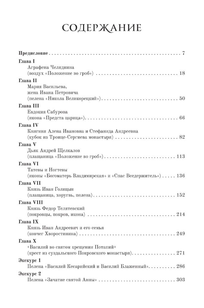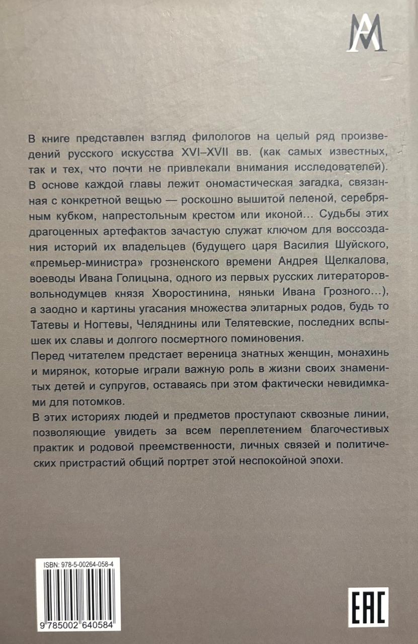 The book presents philologists' perspectives on a wide range of works of Russian art from the 16th and 17th centuries (both the most famous and those that have received little attention from scholars). Each chapter is based on an onomastic riddle associated with a specific object—a luxuriously embroidered shroud, a silver cup, an altar cross, or an icon. The fates of these precious artifacts often serve as a key to reconstructing the stories of their owners (the future Tsar Vasily Shuisky, the "prime minister" of the time of Grozny, Andrei Shchelkalov, the voivode Ivan Golitsyn, one of the first Russian freethinking writers, Prince Khvorostinin, Ivan the Terrible's nanny...), as well as pictures of the decline of many elite families, be they the Tatevs and Nogtevs, the Chelyadnins or the Telyatevskys, their final flashes of glory, and their long posthumous commemoration.