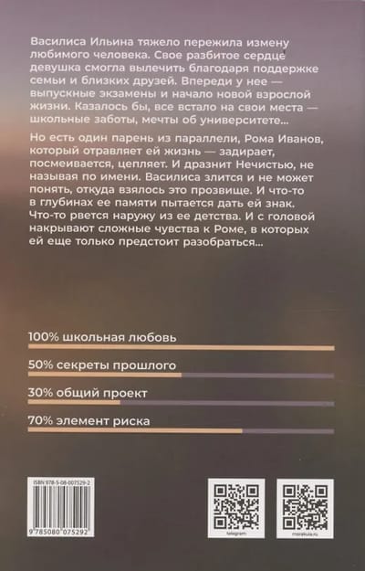 Vasilisa Ilyina suffered greatly after her lover betrayed her. She managed to heal her broken heart thanks to the support of her family and close friends. Ahead of her are final exams and the beginning of a new adult life. It would seem everything has fallen into place—school worries, dreams of university… But there's one boy in her class, Roma Ivanov, who's making her life miserable—taunting, taunting, and picking on her. He even calls her "Unclean," without calling her by name. Vasilisa is furious and can't understand the origin of this nickname. And something deep within her memory is trying to signal her. Something from her childhood is clawing its way out. And she's overcome with complex feelings for Roma, which she has yet to sort out…
