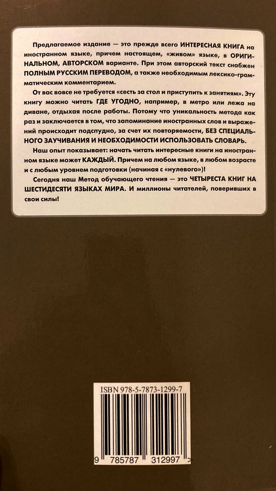 The text of the novella is adapted according to the method of Ilya Frank: it is provided with a literal translation into Russian and the necessary lexical and grammatical commentary. The uniqueness of the method lies in the fact that memorization of words and expressions occurs due to their repetition, without memorization and the need to use a dictionary.