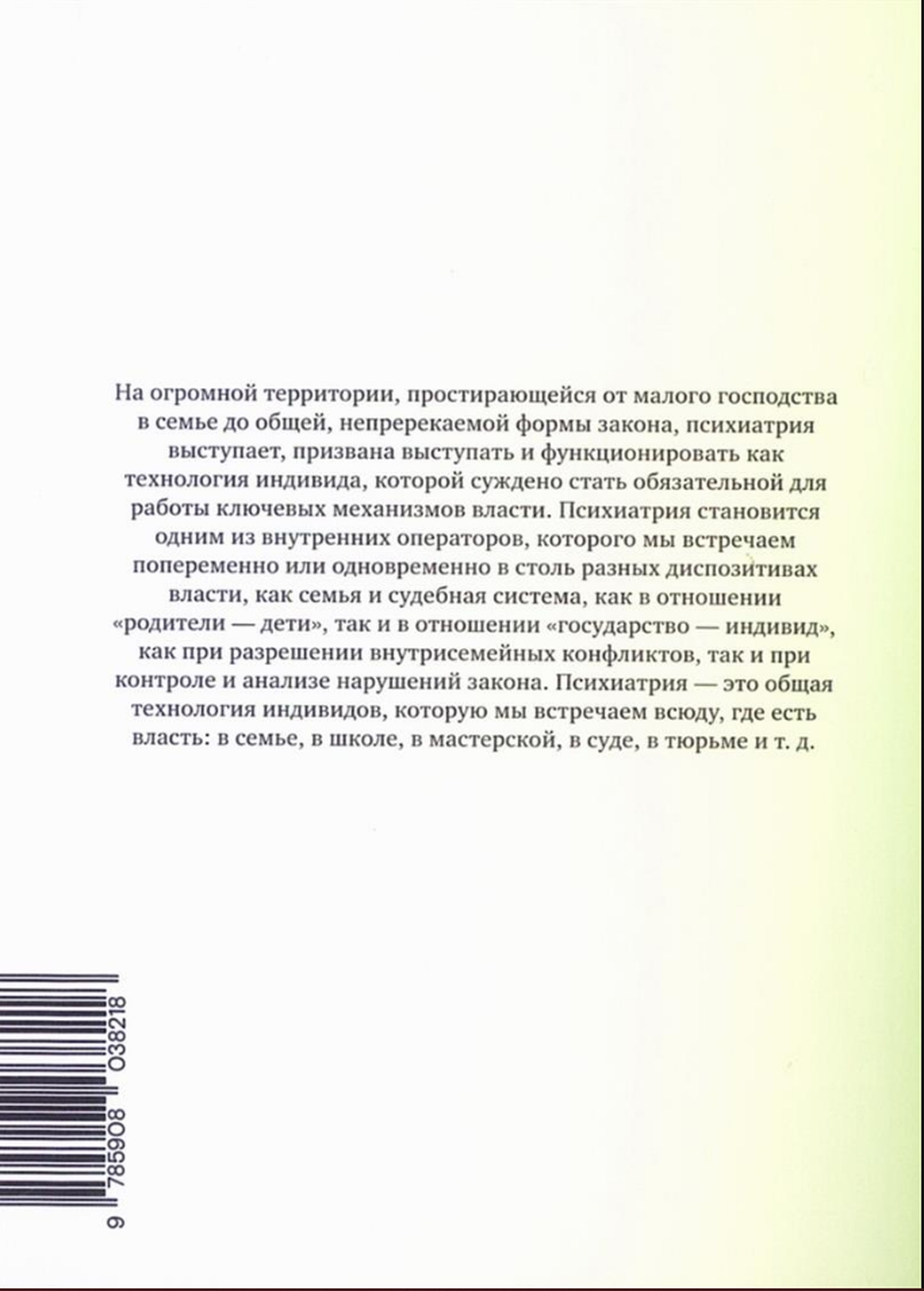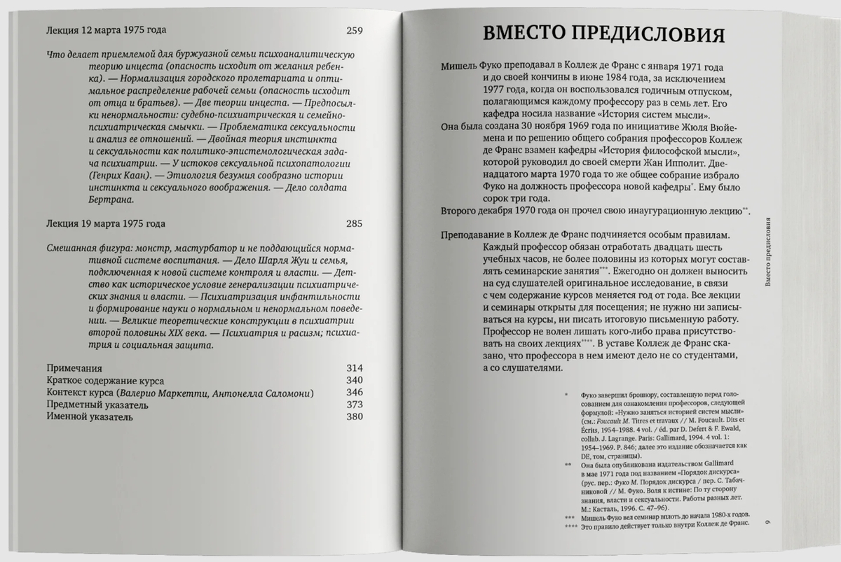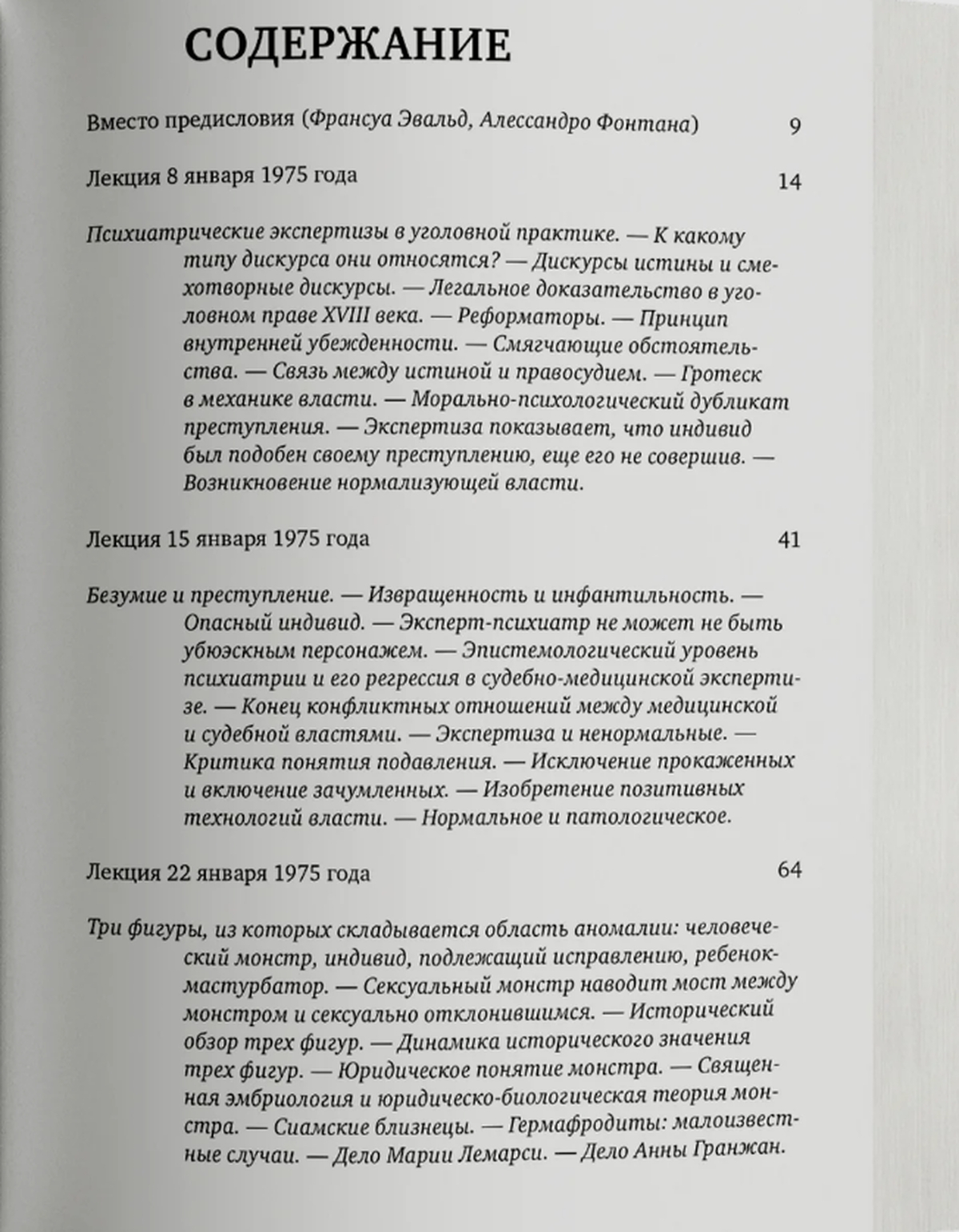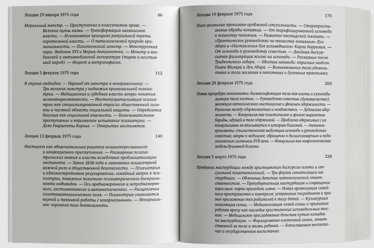 The course "Abnormal" taught in the 1974/75 academic year coincides with one of the peaks of Foucault's research activity and reflects the shift in his primary research interests from the archaeology of discursive formations to the genealogy of apparatuses of knowledge and power. Using nineteenth-century forensic psychiatric examinations and texts related to the practice of post-reform Catholic confession as his primary material, the philosopher discusses the formation of a new—normalizing—power. He places the concept of the normal and abnormal individual at the center of the history of normalizing knowledge, which arose in early psychiatry and gave rise to the concept of sexuality. Foucault examines the formation of this concept within the framework of the medicalization of childhood and analyzes the procedure of confession in the Catholic ministry, thereby paving the way for his final book, Confessions of the Carnal. The course allows one to trace the movement of Foucault's thought at the crossroads of several historical and philosophical paths and, at the same time, serves as a model of insightful and witty scholarly prose.