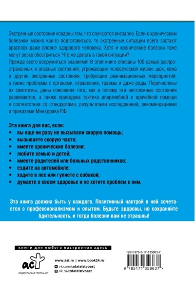Dr. Sergey Vyalov's new book describes 100 of the most common and dangerous conditions that threaten human life: shock, coma, organ problems, exacerbations of chronic diseases, poisoning, trauma, and even childbirth. Their symptoms are listed, explanations are given as to how and why these emergency conditions develop, as well as the tactics of pre-hospital and medical care in accordance with the standards, research results, recommendations and orders of the Ministry of Health of the Russian Federation. The book will be useful for both ordinary people without medical education and specialists in emergency medicine.