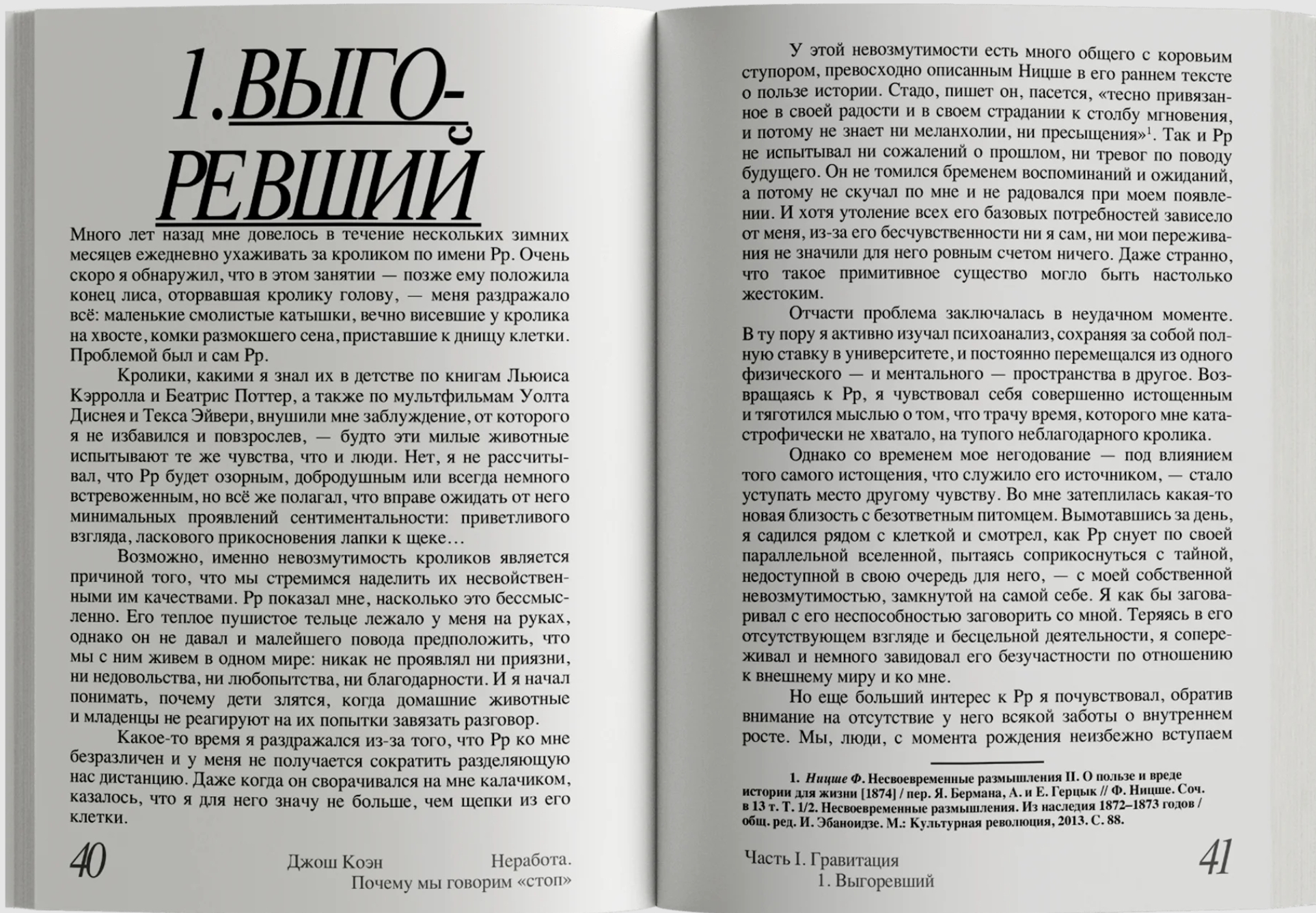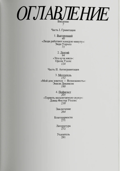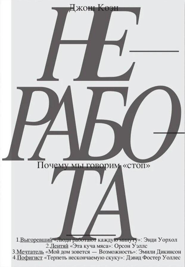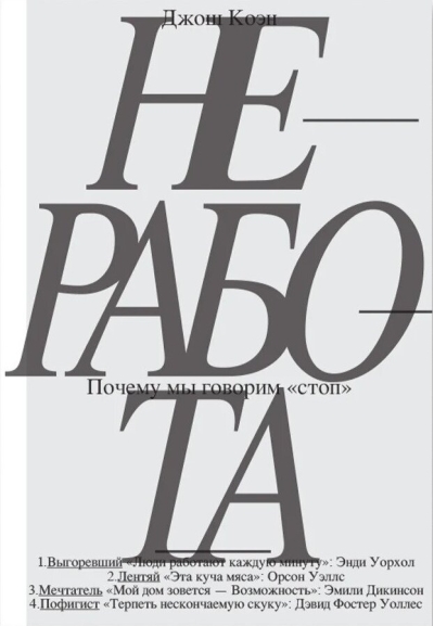 British psychoanalyst Josh Cohen's book explores our relationship with work, or more precisely, the ingrained desire within each of us not to work. This desire, far from seamlessly coexists with the desire to work—and to achieve success, prestige, and well-being—and, as the author suggests, is no less, if not more, important, even defining. This desire is familiar to us from childhood, when it is easily satisfied, but we learn to suppress it and become accustomed to devoting all our energy to work, sometimes forgetting that life is not limited to it. Sometimes the result is great achievement in our chosen profession, sometimes depression, sometimes both. How do we deal with the need for "non-work," which is impossible to fully realize, but also extremely dangerous to deny and suppress? The author seeks answers to this seemingly insoluble question through his own life experience, the stories of his patients, and the lives of several prominent individuals who faced the conflict between work and non-work head-on—Emily Dickinson, Orson Welles, Andy Warhol, and David Foster Wallace. This text, inspired by Josh Cohen's desire to understand himself and able to help us do the same, is composed of autobiographical essays, psychoanalytic notes, and insightful observations on the nature of creativity.