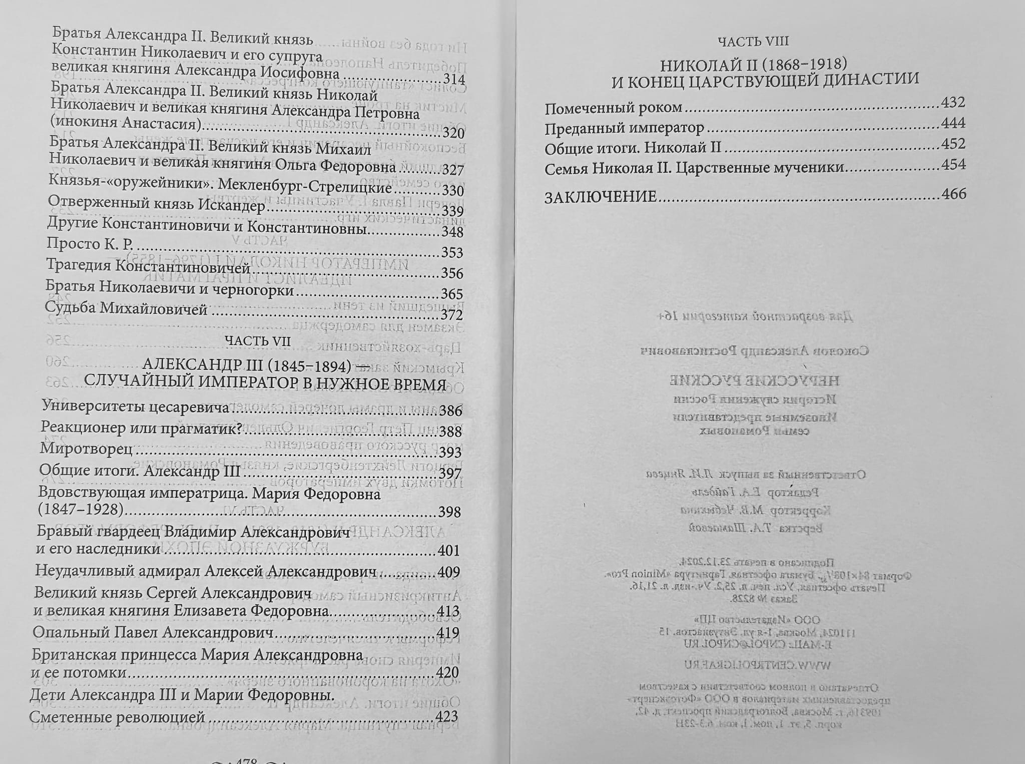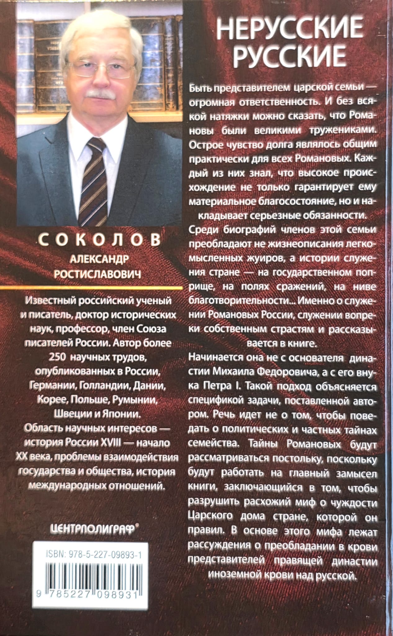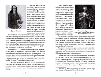 Being a member of the royal family is a tremendous responsibility. And it's no exaggeration to say that the Romanovs were hard workers. A keen sense of duty was common to virtually all the Romanovs. Each knew that their high birth not only guaranteed them material well-being but also imposed serious responsibilities. The biographies of this family are dominated not by stories of frivolous revelers, but by stories of service to the country—in public life, on the battlefield, and through charity. It is precisely the Romanovs' service to Russia, service despite their own passions, that this book recounts. It begins not with the dynasty's founder, Mikhail Feodorovich, but with his grandson, Peter I. This approach is explained by the specific nature of the author's task. The aim is not to reveal the family's political and private secrets. The secrets of the Romanovs will be explored to the extent that they contribute to the book's main goal, which is to dispel the common myth of the Royal House's alienation from the country it ruled. This myth is based on the notion that foreign blood predominates over Russian blood in the ruling dynasty.