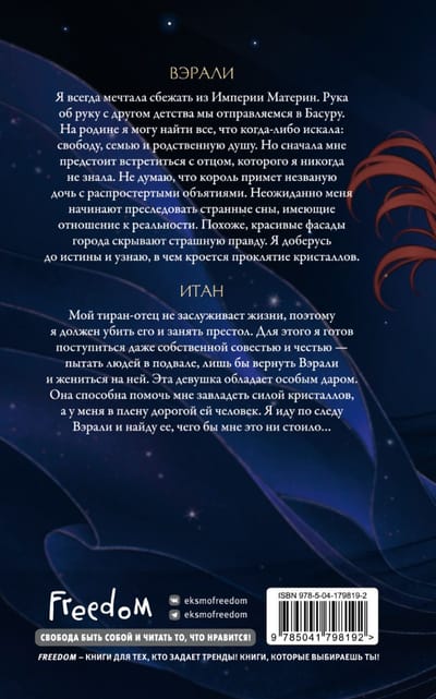 I've always wanted to escape the Mother Empire. Hand in hand with a childhood friend, we go to Basura. At home, I can find everything I have ever sought: freedom, family and soul mate. But first I have to meet a father I never knew. I don't think the king will accept the uninvited daughter with open arms. Suddenly, I begin to be haunted by strange dreams related to reality. It seems that the beautiful facades of the city hide the terrible truth. I'll get to the truth and find out what the curse of crystals is.