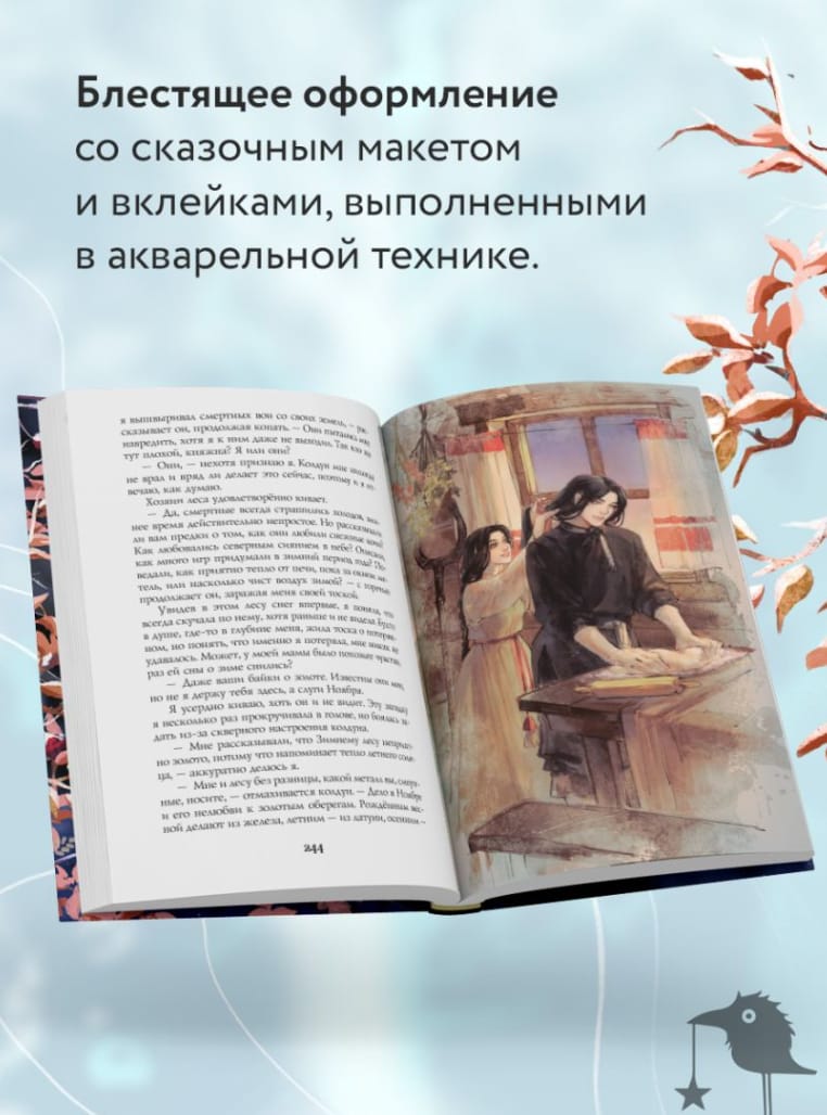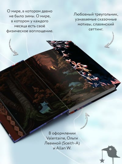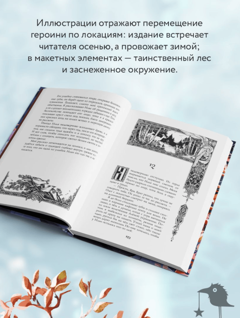 The illustrations reflect the movement of the heroine in the locations: the publication meets the reader in the fall, and sees off in the winter; in the mock-up elements - a mysterious forest and a snowy environment.