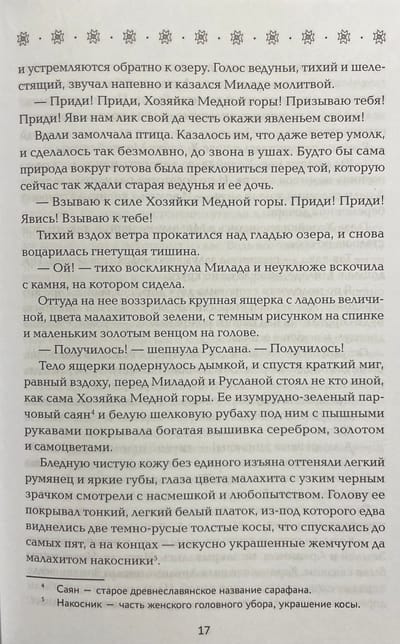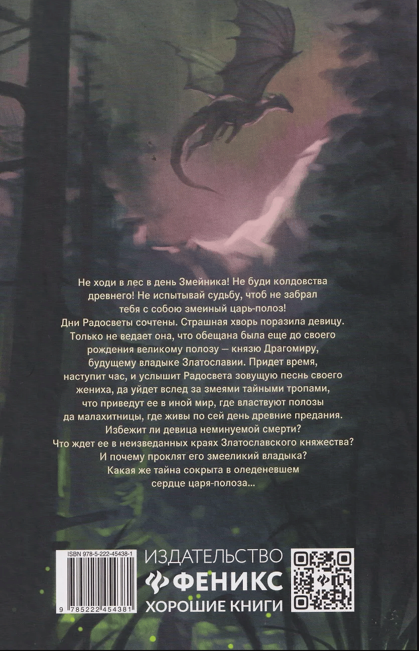 Radosveta's days are numbered. A terrible illness has struck the maiden. But she doesn't know that she was promised even before her birth to the great snake—Prince Dragomir, the future ruler of Zlatoslavia. The time will come, the hour will dawn, when Radosveta will hear the beckoning song of her betrothed, and she will follow the secret paths of the snakes that will lead her to another world, where snakes and malachite damsels rule, where ancient legends live on to this day. Will the maiden escape certain death? What awaits her in the uncharted lands of the Zlatoslav principality? And why is its snake-faced ruler cursed? What secret is hidden in the frozen heart of the snake king...