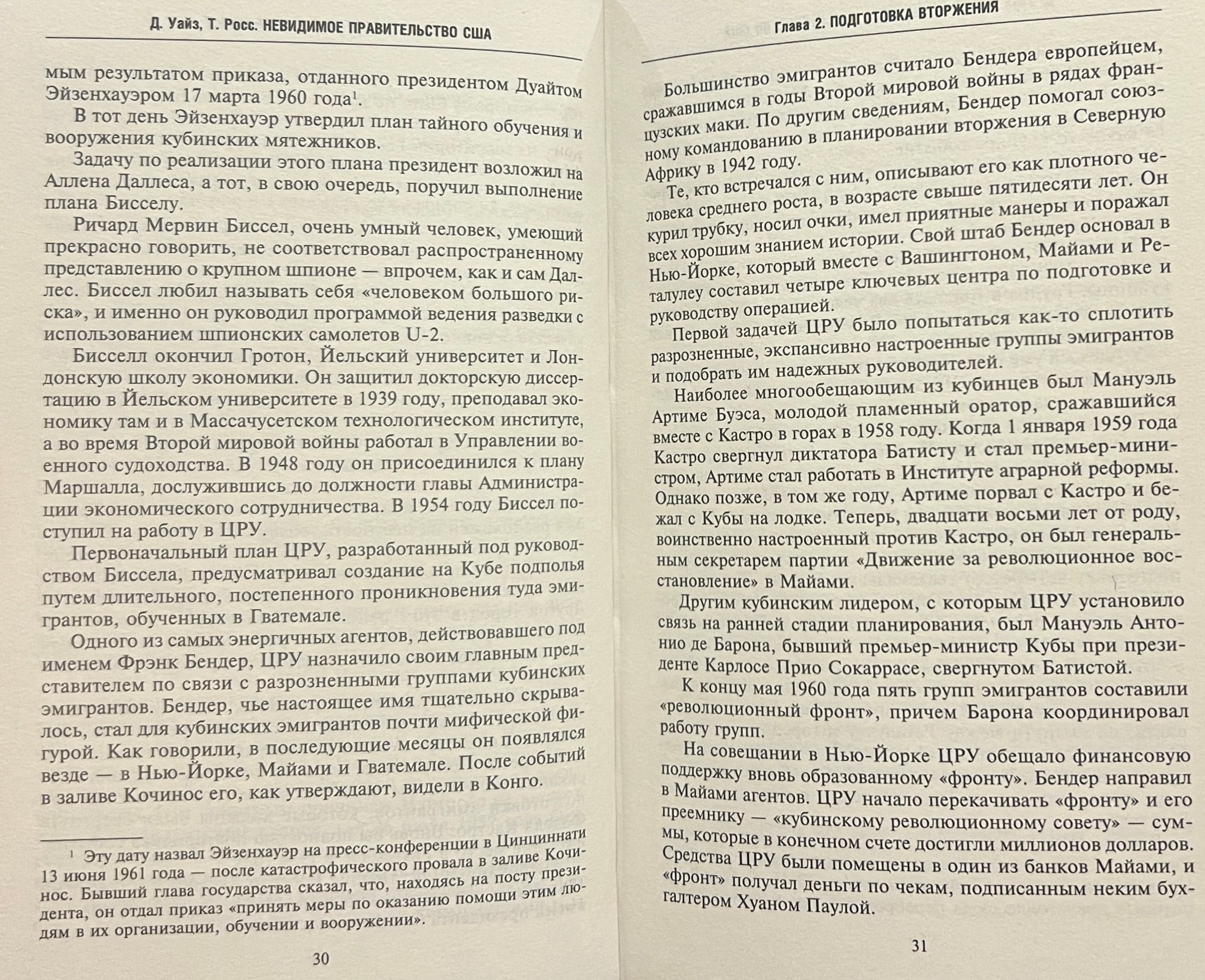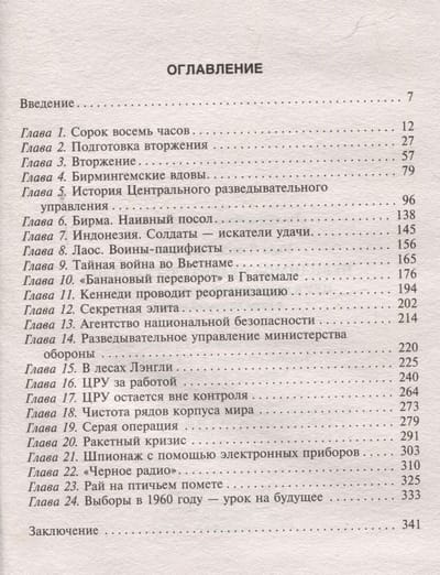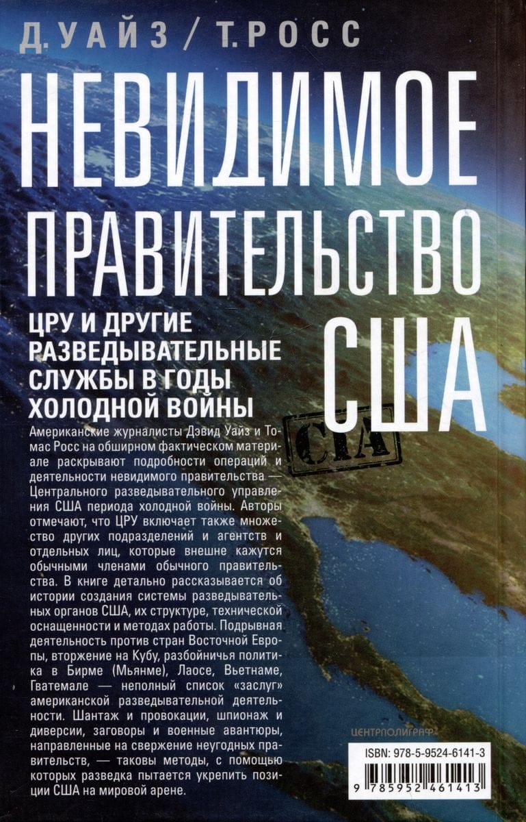 American journalists David Wise and Thomas Ross use extensive factual material to reveal details of the operations and activities of the invisible government - the U.S. Central Intelligence Agency of the Cold War period. The authors point out that the CIA also includes many other divisions and agencies and individuals who outwardly appear to be ordinary members of the regular government. The book details the history of the U.S. intelligence system, its structure, technical equipment, and methods of operation. Subversive activities against the countries of Eastern Europe, invasion of Cuba, brigand policy in Burma, Laos, Vietnam, Guatemala - an incomplete list of "merits" of American intelligence activities. Blackmail and provocations, espionage and sabotage, conspiracies and military adventures aimed at overthrowing unwanted governments - these are the methods by which intelligence tries to strengthen the U.S. position on the world stage.