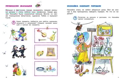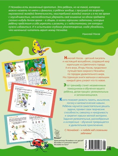 Nikolai Nosov is a children's writer and a real magician who created the world of the short people from the Flower City. And his grandson, Igor Nosov, continued the travels of mischievous Neznayka through the cities of the wonderful world. On the pages of the book, babies and toddlers learn something new every day. This simulator will be an indispensable assistant in teaching your child, making the process exciting and memorable. The book will help develop memory, thinking, logic and math skills. The child will learn to solve problems independently, show his creative abilities, wit and ingenuity and strengthen fine motor skills. The tasks are exciting, varied and interesting - learning turns into an amazing adventure. With Neznayka - to victory over difficult tasks!