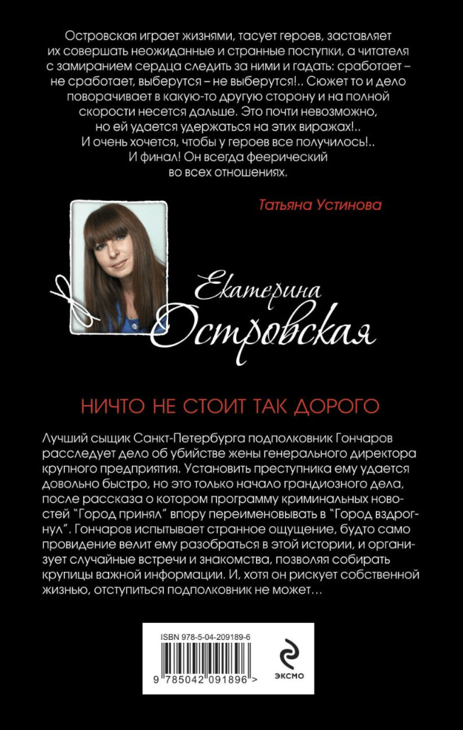 Tatiana Ustinova recommends: Ekaterina Ostrovsky not only invents and records detective stories. She has a rare ability to create entire worlds on the pages of her books - fascinating, mysterious, alluring, but seemingly a little fake. And this lack of self-interest is only good for the works. I also like all Ostrovsky’s books because Catherine uses the full power over her own fictional worlds to restore justice in reality.”.
