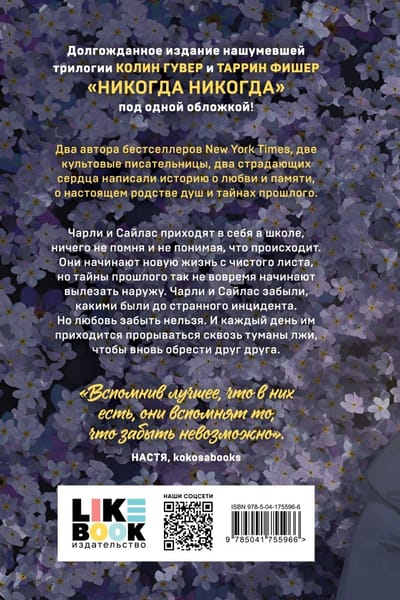 Two New York Times bestselling authors, two iconic writers of sentimental prose, have written a story of love and memory, of true soul mates and the secrets of the past. The novel was released in 2015 and was immediately warmly received by audiences. So hot, in fact, that after numerous requests for a sequel, Hoover and Fisher decided to turn the story into an entire trilogy after all. This reissue comes out in a set containing all parts of the trilogy at once. New stylish design, visually showing the path from darkness to light along the road of forget-me-nots - a symbol of constancy and eternal love that overcomes all obstacles.