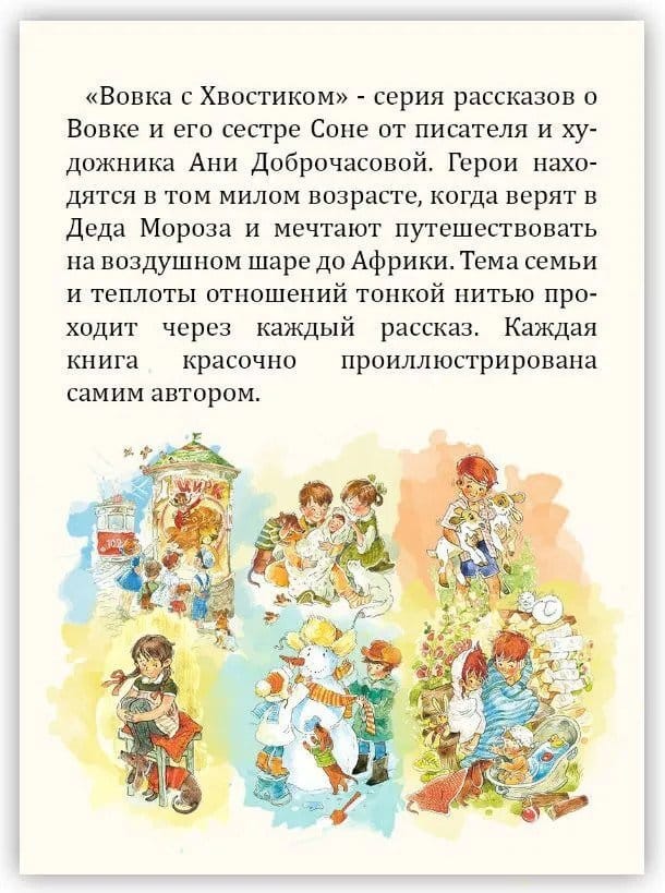 Each member of the Grushin family has a different talent. Mom knows how to do everything quickly. Dad composes poems and deftly puts the children to bed. Grandpa tells fairy tales and performs the "dance of the little ducklings". Not lagging behind the adults and the younger generation: Vovka learned to speak the language of babies, Sonya can draw their dreams, and Malek, like a magnet, fantastically attracts others. And also all the Grushins have their own little secrets and personal stories. You can learn about some of them from the next book of adventures of Vovka and Tail.