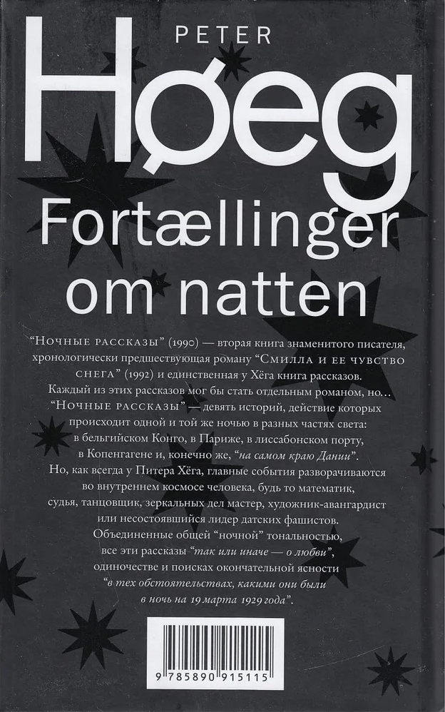 The Night Stories are nine stories set on the same night in different parts of the world: in the Belgian Congo, in Paris, in the port of Lisbon, in Copenhagen and, of course, on the very edge of Denmark. But, as always with Peter Høeg, the main events unfold in the inner space of a person, whether he is a mathematician, a judge, a dancer, a mirror master, an avant-garde artist or a failed leader of the Danish fascists. United by a common “nocturnal” tonality, all these stories are “one way or another about love,” loneliness, and the search for ultimate clarity, “in the circumstances as they were on the night of March 19, 1929.”.