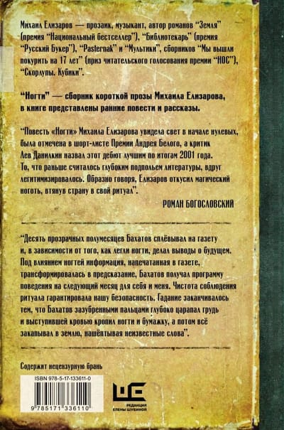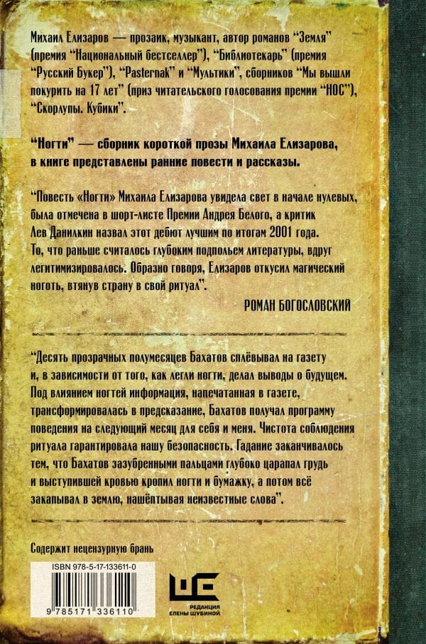 Mikhail Elizarov - prose writer, musician, author of the novels "Earth" (National Bestseller Award), "The Librarian" (Russian Booker Prize), "Pasternak" and "Cartoons", collections of short stories "We went out to smoke for 17 years" (the prize of the reader's vote of the award "NOS"), "Cubes". "Nails" - a collection of short prose by Mikhail Elizarov, the book presents early novellas and short stories. "The story "Nails" by Mikhail Elizarov saw the light of day in the early noughties, was shortlisted for the Andrei Bely Prize, and critic Lev Danilkin named this debut the best of 2001. What had previously been considered a deep underground of literature was suddenly legitimized. Figuratively speaking, Elizarov bit off the magic nail, drawing the country into his ritual." (Roman Bogoslovsky) "Ten transparent crescents Bakhatov spat on the newspaper and, depending on how the nails lay, drew conclusions about the future. Under the influence of the nails the information printed in the newspaper was transformed into a prediction, Bakhatov received a program of behavior for the next month for himself and me. The purity of the observance of the ritual guaranteed our safety. The fortune-telling ended with Bakhatov scratching his chest deeply with jagged fingers and sprinkling the blood on his nails and the paper, then burying everything in the ground, whispering unknown words.