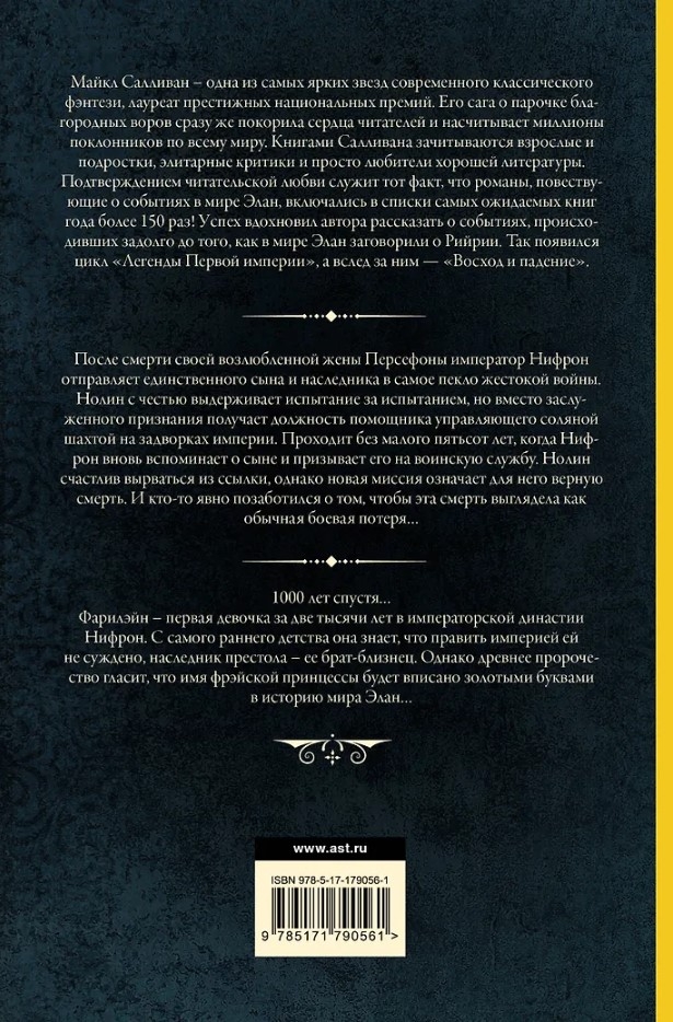Michael Sullivan is one of the brightest stars of modern classic fantasy, winner of prestigious national awards. His saga about a pair of noble thieves immediately captured the hearts of readers and has millions of fans worldwide. Sullivan's books are read by adults and teenagers, elite critics, and simply lovers of good literature. This readership is confirmed by the fact that novels set in the world of Elan have been included in lists of the most anticipated books of the year over 150 times! This success inspired the author to tell the story of events that took place long before Riyria was even mentioned in the world of Elan. This is how the "Legends of the First Empire" series was born, followed by "Rise and Fall."