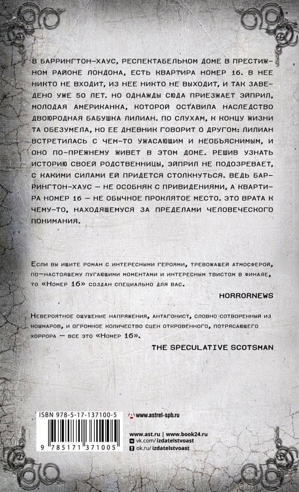 In Barrington House, a respectable house in a prestigious area of London, there is apartment number 16. No one enters it, no one leaves it, and it's been that way for 50 years. But one day April, a young American woman who was left an inheritance by her great-aunt Lillian, arrives here. Rumor has it that by the end of her life she had become insane, but her diary tells a different story: Lillian encountered something terrifying and inexplicable, and it still lives in this house. Determined to discover her relative's story, April has no idea what forces she'll have to face. After all, Barrington House is not a haunted mansion, and apartment number 16 is no ordinary cursed place. It's a gateway to something beyond human comprehension.