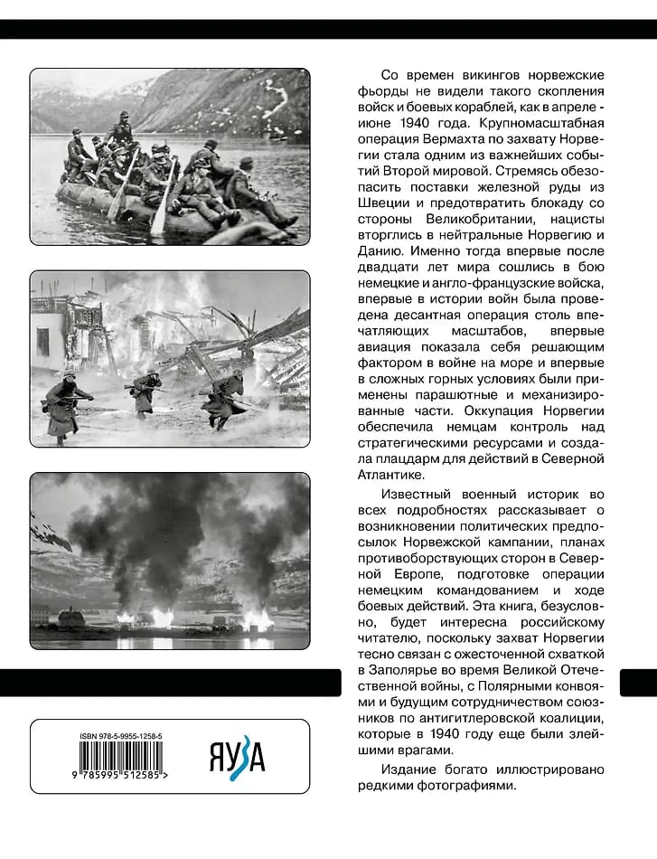 Not since the Viking Age had the Norwegian fjords seen such a concentration of troops and warships as in April-June 1940. The Wehrmacht's large-scale operation to capture Norway became one of the most important events of World War II. Seeking to secure iron ore supplies from Sweden and prevent a British blockade, the Nazis invaded neutral Norway and Denmark. It was then that German and Anglo-French forces clashed in combat for the first time in twenty years of peace, for the first time in warfare an amphibious operation of such an impressive scale was conducted, for the first time aviation proved itself a decisive factor in naval warfare, and for the first time parachute and mechanized units were used in difficult mountainous conditions. The occupation of Norway secured German control over strategic resources and created a foothold for operations in the North Atlantic.