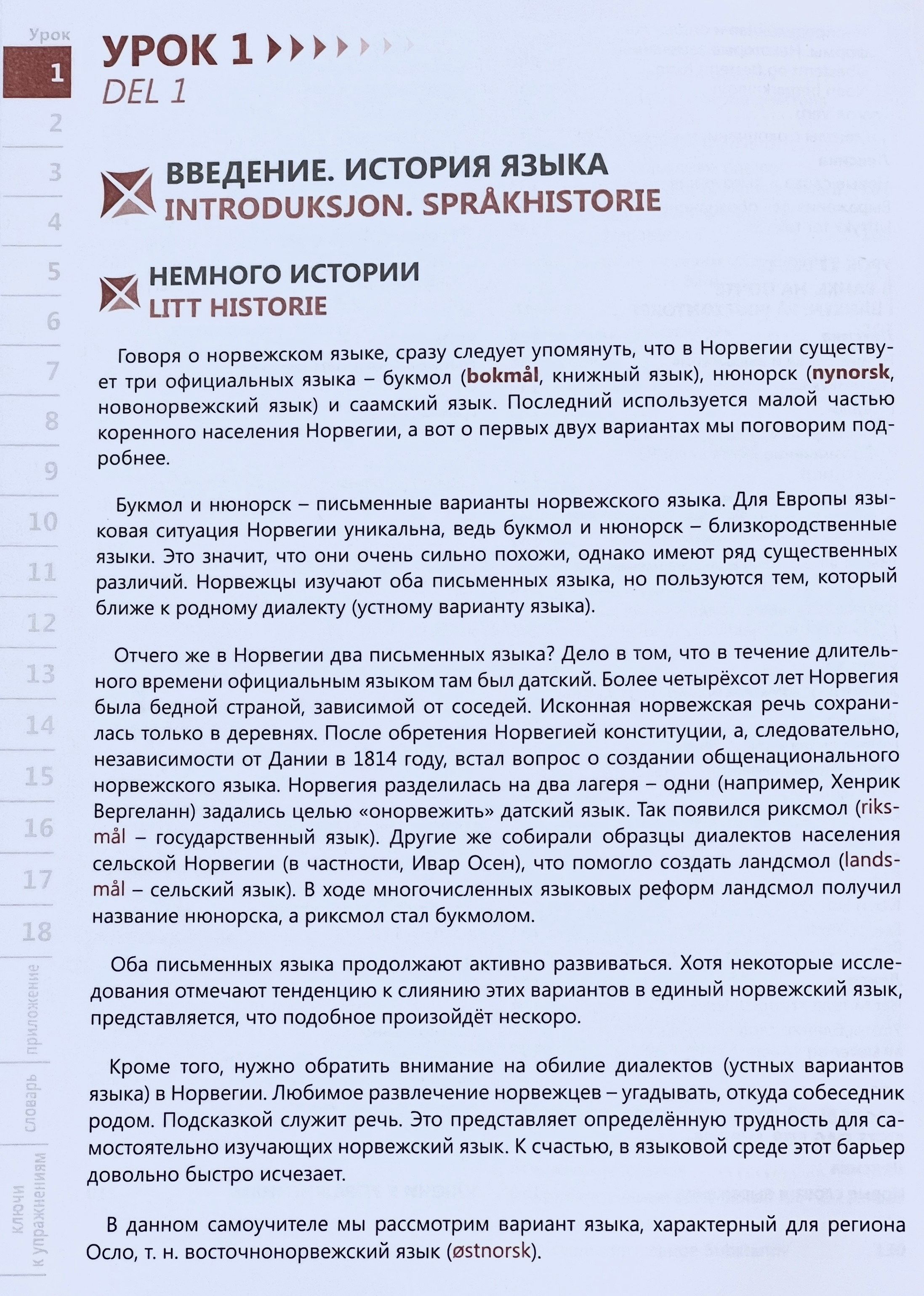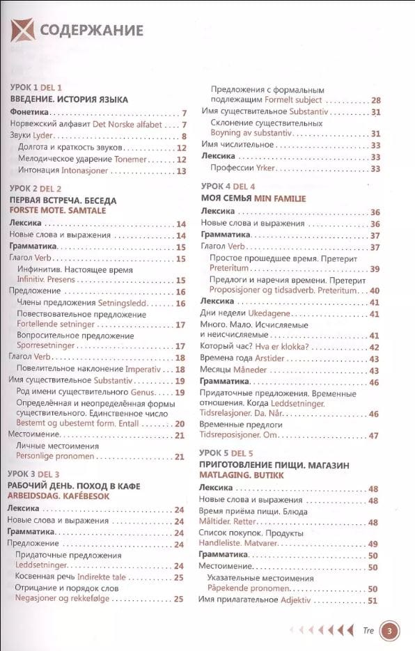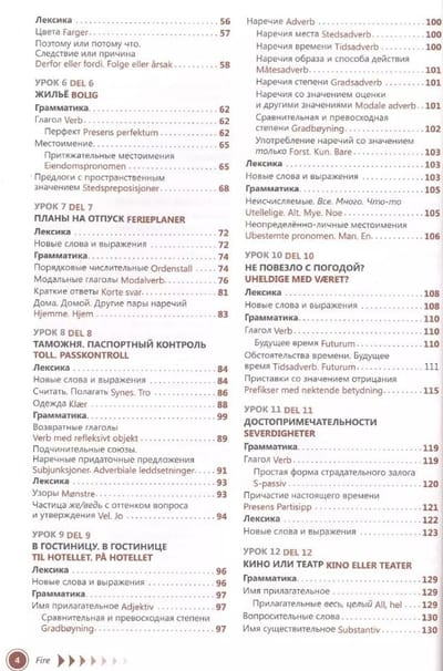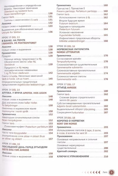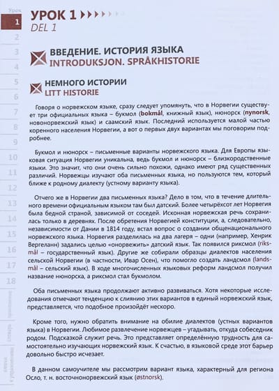 This self-study book is intended for independent learners of Norwegian. It allows you to develop the speech skills necessary for communicating and reading simple literature, and to master the basics of grammar: the self-study lessons familiarize you both with the grammatical features of the language and with common everyday vocabulary. Having mastered it, you can easily get out of any situation when communicating directly with the people of Norway. For quick memorization of common speech constructions, carefully read the selections with lexical material accompanied by transliteration (the thematic list is given in the contents). In each lesson of the self-study book you will find descriptions of lexico-grammatical categories of all parts of speech, exercises to memorize the studied material, texts with the use of active speech structures. At the end of the book there are lesson keys to check the exercises. The self-teaching lessons are supplemented with a dictionary, which can be used to translate unfamiliar words found in the exercises. There is also country information in the book, which will undoubtedly come in handy when traveling in Norway.