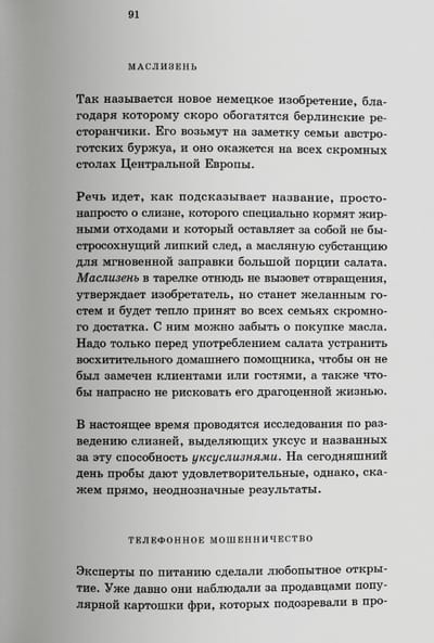 A collection of satirical essays by French writer and journalist Gaston de Pavlovsky (1874–1933) immerses readers in a world of imaginary inventions that promise to rid humanity of all inconveniences. Using the language of advertising, newspaper columns, and factory catalogs, Pavlovsky creates an encyclopedia of supposed discoveries—from anti-slip soap with nails to a boomerang that never returns—that blur the line between usefulness and absurdity. The author's humor is precise and merciless: Pavlovsky satirizes the culture of excessive comfort long before the advent of digital utopias. The book, which inspired Marcel Duchamp and Francis Picabia, reads today as a witty prophecy of a world where ingenuity turns into meaninglessness.