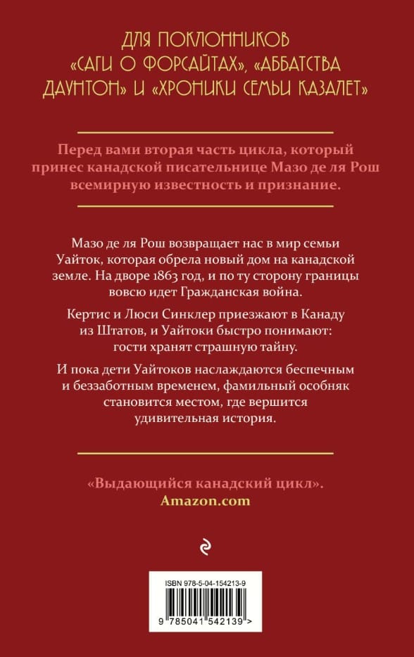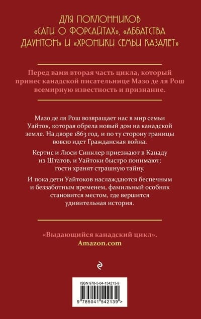 Mazo de la Roche takes us back to the world of the Whiteoak family, who have found a new home on Canadian soil. It is 1863, and the Civil War is raging across the border. Curtis and Lucy Sinclair arrive in Canada from the States, and the Whiteoaks quickly realize that their guests are keeping a terrible secret. And while the Whiteoak children enjoy a carefree and carefree time, the family mansion becomes the setting for an amazing story.
