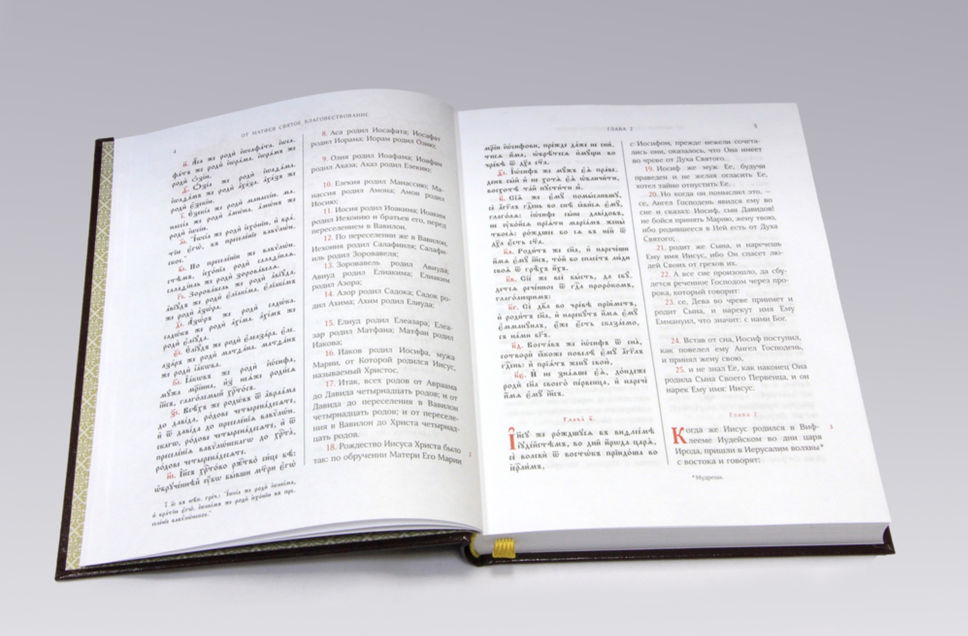 The Church Slavonic text of the four Gospels and the Apostle is given in the liturgical edition. The Russian text is the Synodal Translation of the New Testament, first published in 1862. The Church Slavonic and Russian texts are arranged in two parallel columns. During services, the New Testament is read in Church Slavonic. The Russian translation makes it easier to understand unfamiliar words and difficult phrases for those who don't yet speak Church Slavonic.